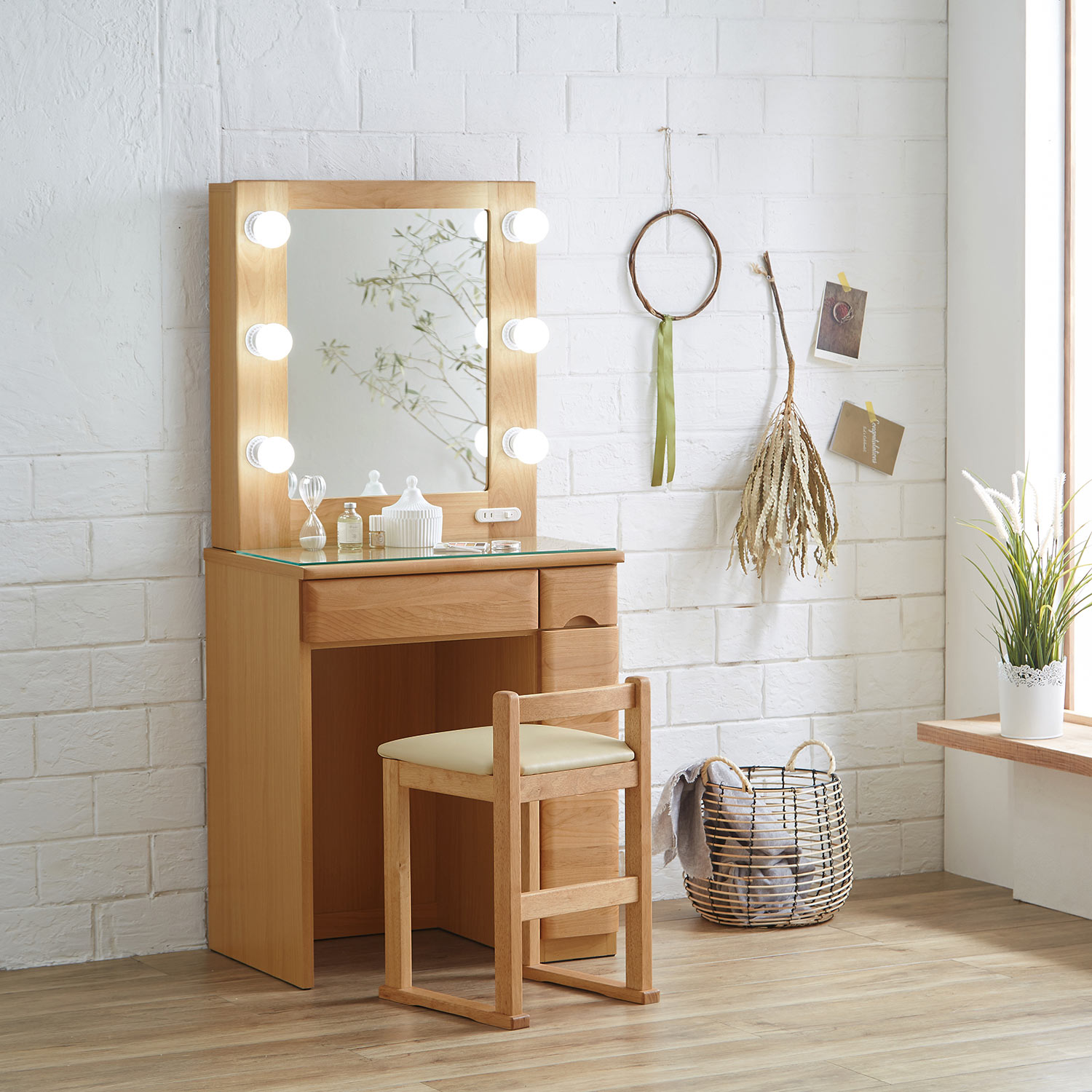 天然木を使用した、上質感のあるドレッサー大きなミラーの両サイドに照明を備え、様々な角度からお顔を照らす事で、メイクの際に出来る影を取り除き、メイクしやすい環境をつくります。天板下の引出しには小さな整理ボックス付きで、細かなメイクグッズの収納に便利サイドにはボトルも立てて収納できる深さ違いの引出しが付いています。天板にコンセント付きでヘアセットも一度に出来ます。スツールもセット