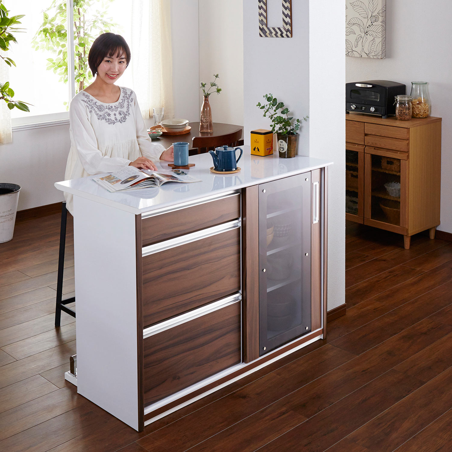 しっかり収納しながら空間の間仕切りができるカウンター天板下にはマガジンラックがついており、お気に入りの雑誌など飾ることができます。裏面の天板下にはBOXを置けるスペースを大量に備えており、キッチン周りの小物などお好みで仕分けて収納できる仕様背面に足置き用のバーが付いていて、イスを置いてカウンターとして使用できます。天板はお手入れしやすい強化プリント紙を使用ツートンの木目調デザインでお部屋になじみやすい