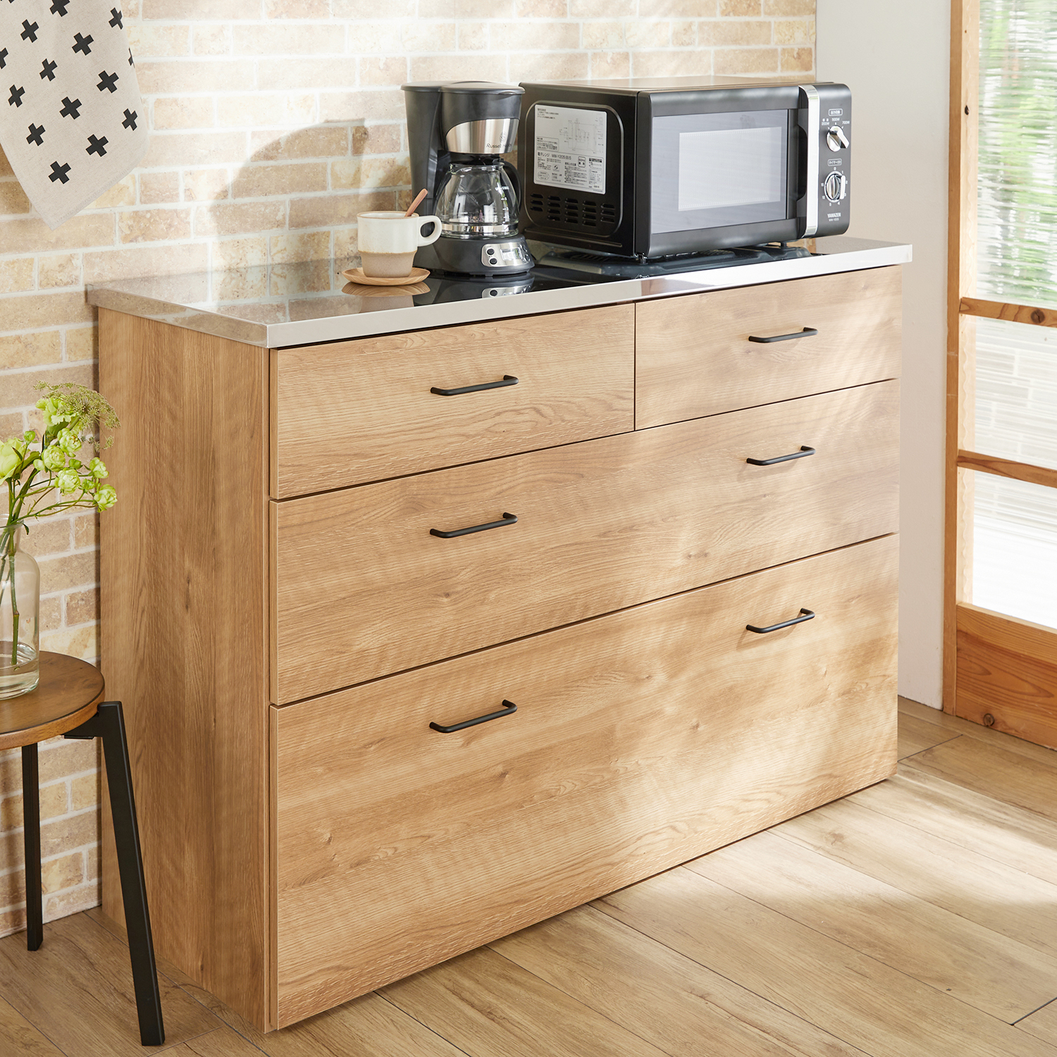古材風シートとステンレス天板がカッコいいキッチンカウンター天板には調理家電も置け、作業台としても活躍引出しは全段フルスライドレールで開閉スムーズ深めの引出しで収納量もたっぷり背面化粧仕上げなので、間仕切りとしても使用できます