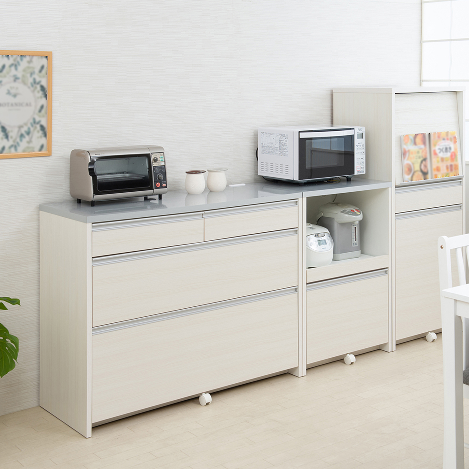 天板にはステンレススチールを使用家電・食品・食器類をまとめて収納できる充実の収納力天板下にはスライドテーブル付きさっと引出しで作業台として使えます。背面は化粧仕上げで間仕切り使いも