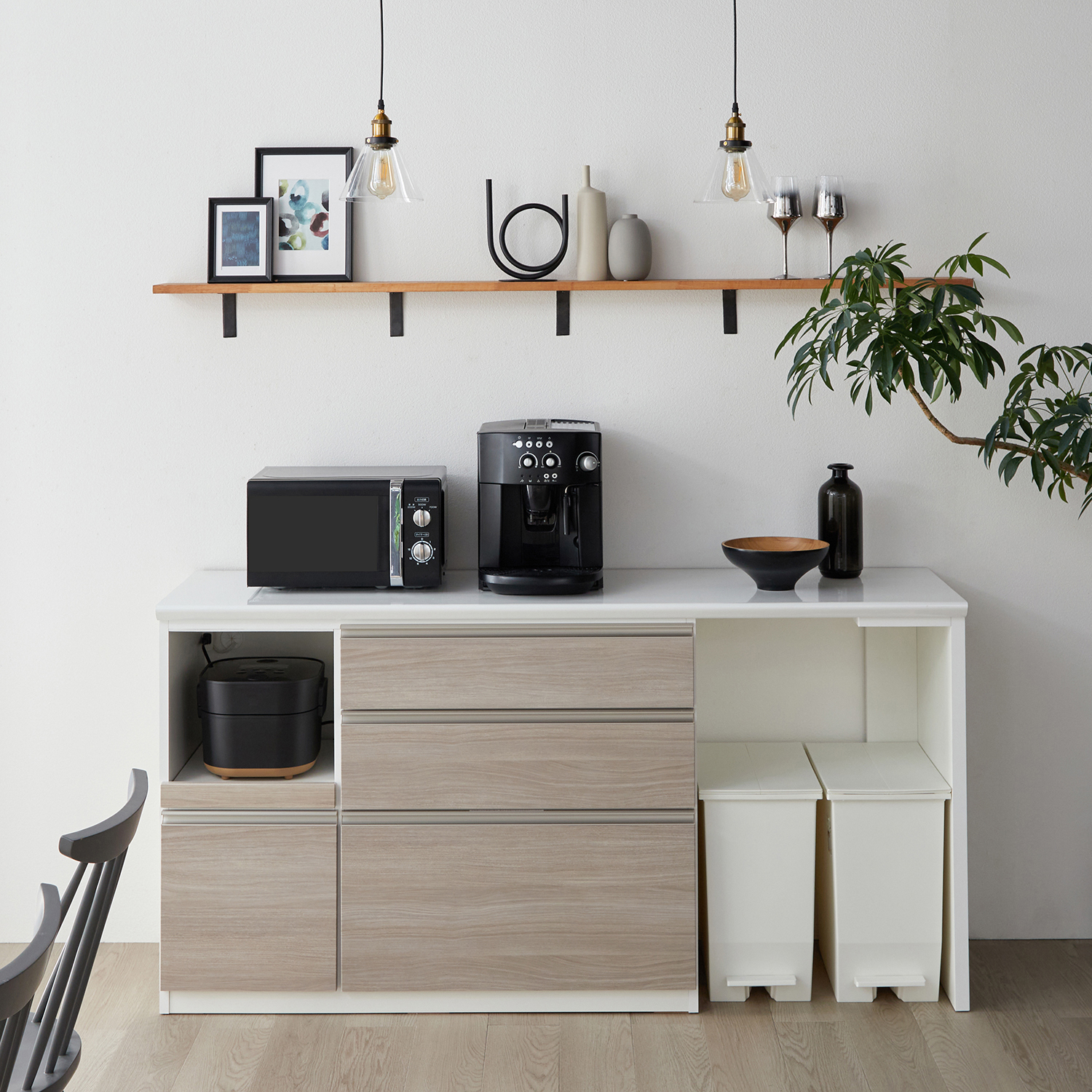 天板がスライドするのでキッチンのスペースがフルに活用でき、効率的で無駄のないキッチン収納が完成カトラリーから大型レンジまで、さまざまなキッチン用品を使いやすくひとまとめにできるカウンター炊飯器やポットなどの家電はスライド棚に収納。スライドさせれば、ダストボックスが2個、3個と置けます。天板は汚れに強い仕様で、作業台としても使えます。