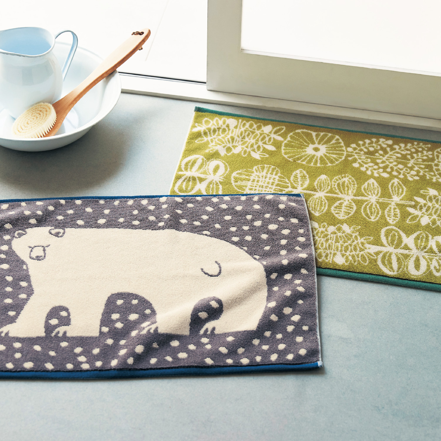 速乾性に優れた特殊機能糸「シャレード(R)AD」を使用洗い替えに便利な2柄セット水分を素早く吸収し、すぐに乾いてサラサラに。それでいて、ふんわりやさしい質感です。タオル素材だから手軽に洗濯しやすいのも魅力。かわいいしろくまとモダンなボタニカル柄をセットに)