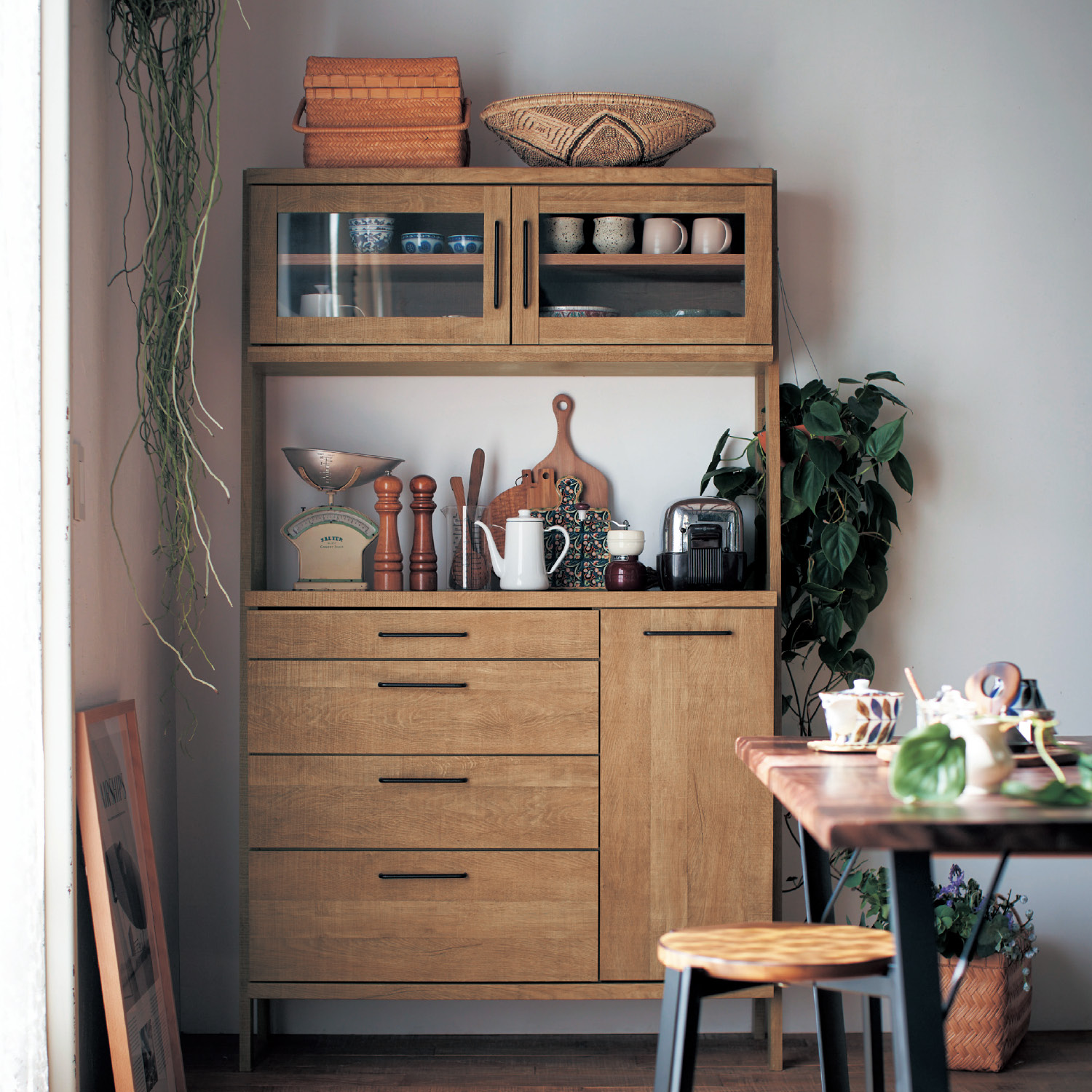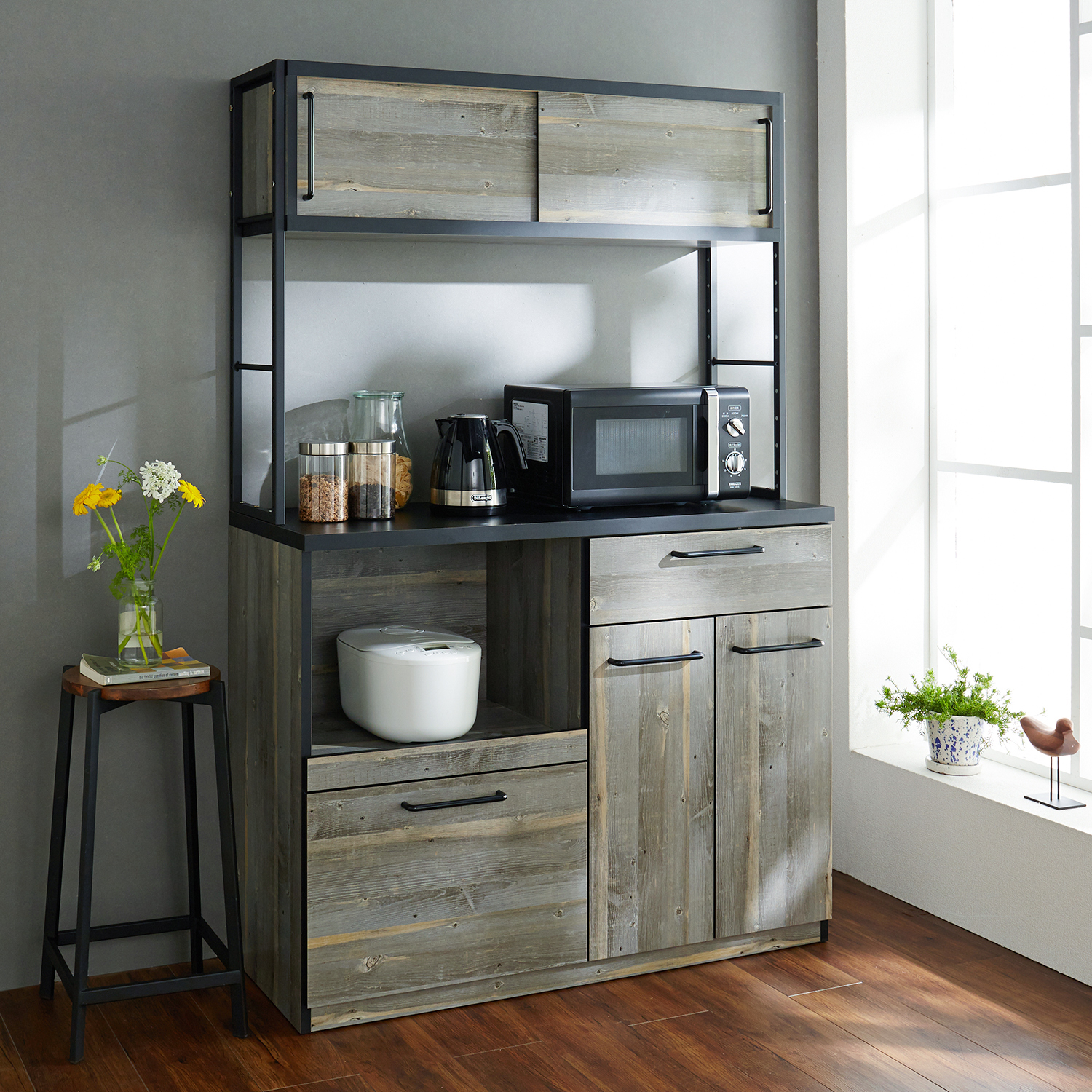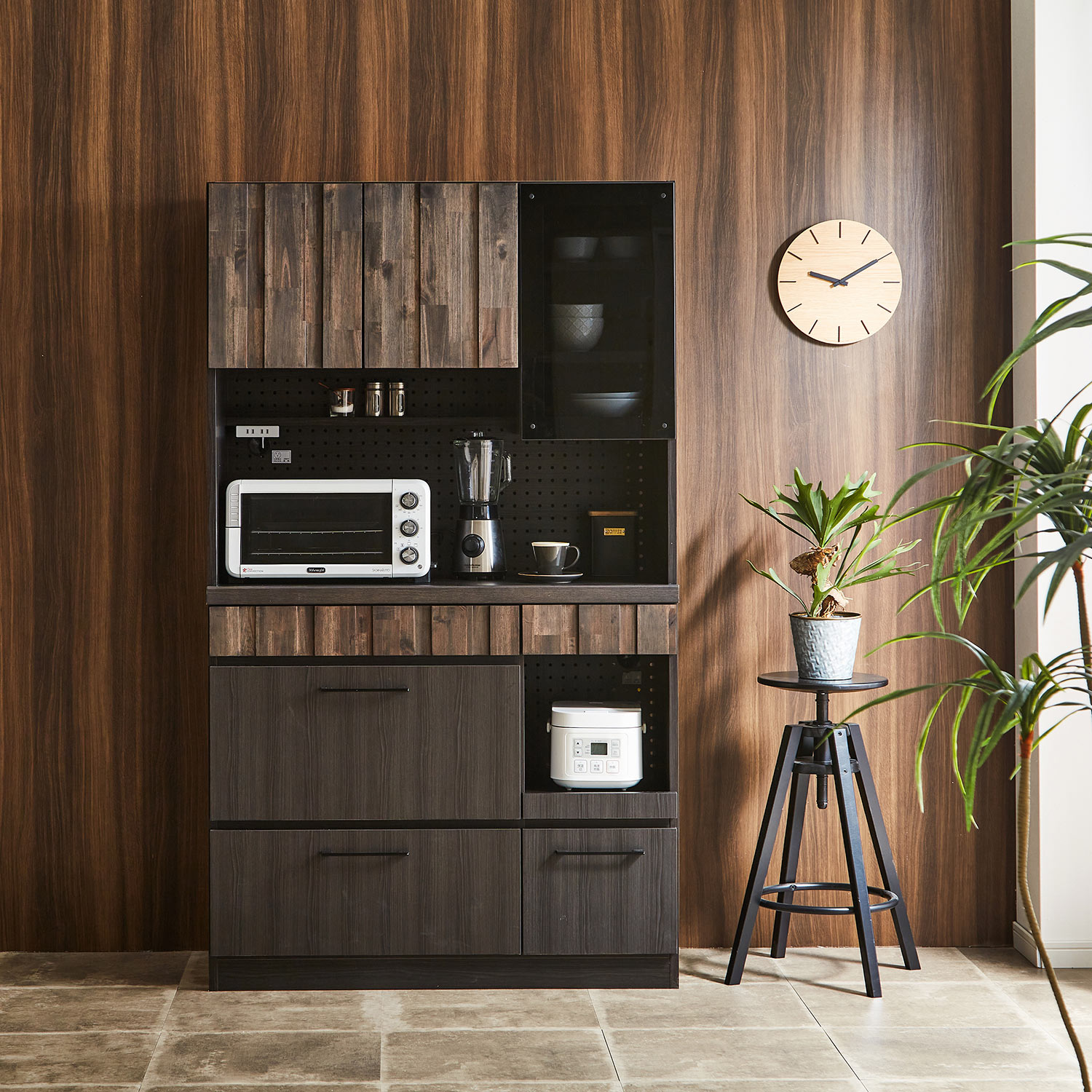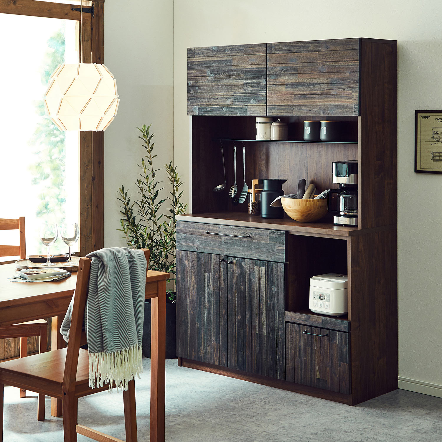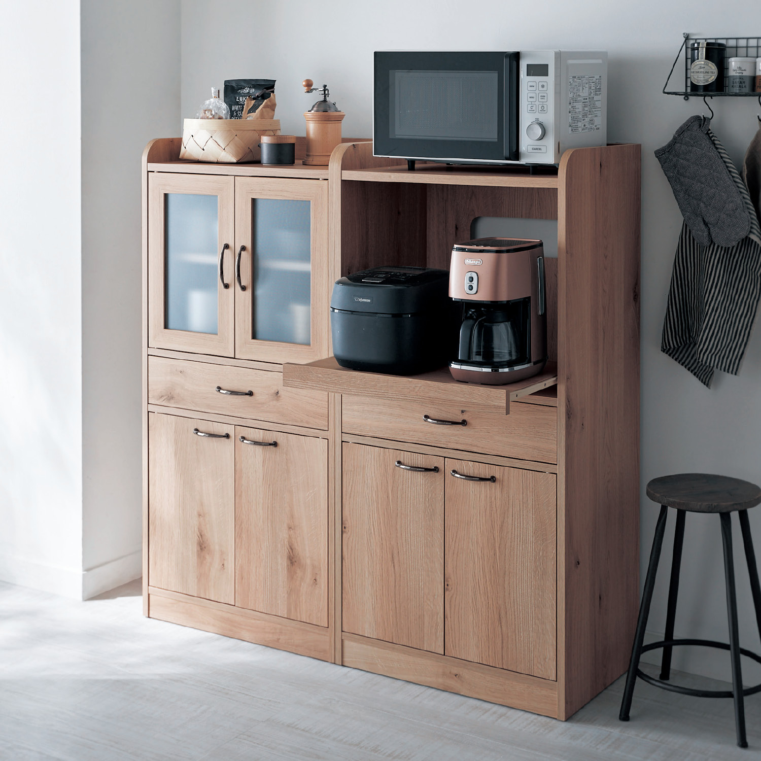 レンジや食器、食材ストックなどをしっかり収納できる、コンパクトなキッチンボードA、Dタイプは炊飯器などを置くのに便利な背面コード穴&スライド棚が付きAタイプの下段の引出しは奥まで引き出せるフルスライドレール式の引出し付き隠してスッキリ収納できるB、Cタイプは、扉の中に可動棚付き表面の木目調シートはオーク柄)
