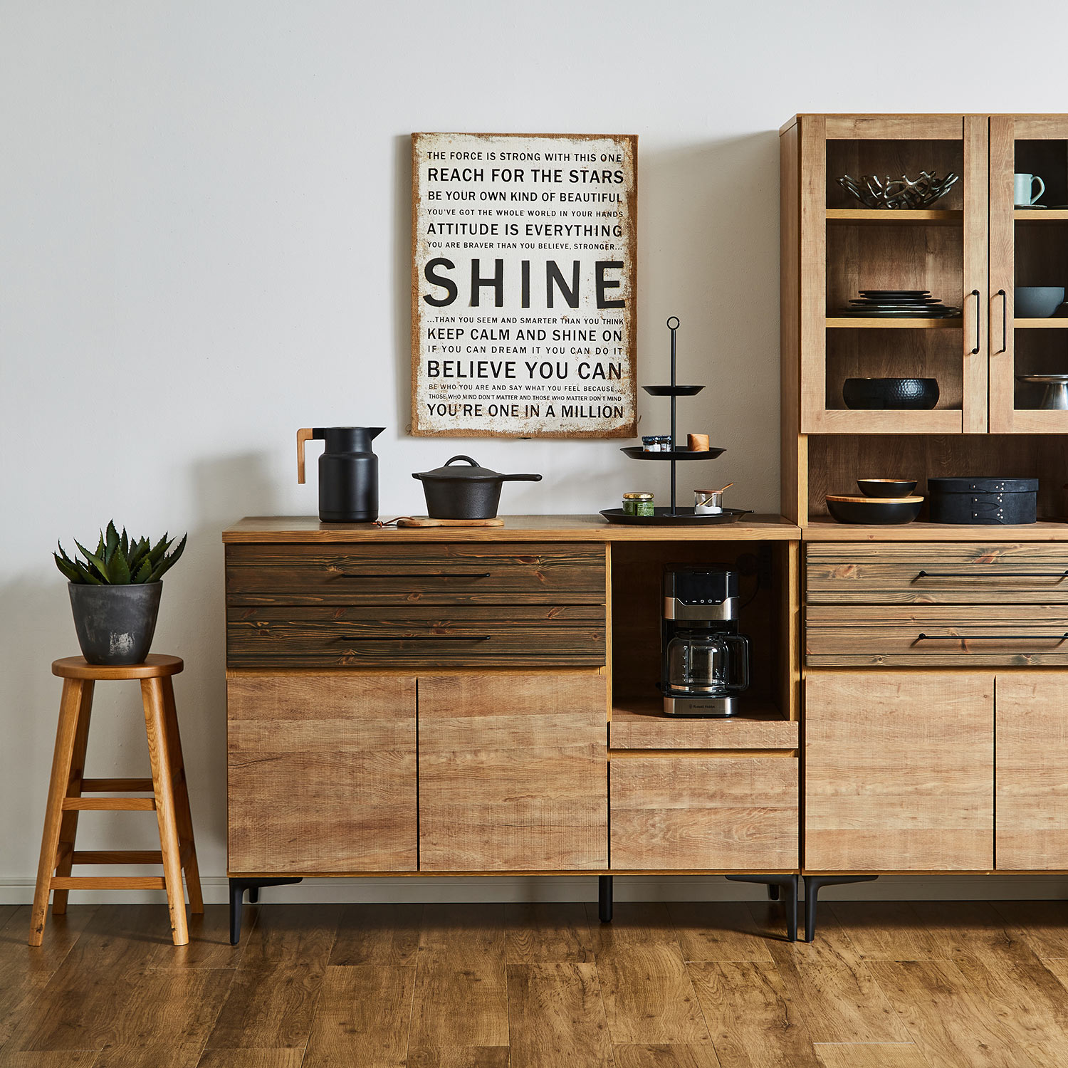 味のある木目調シートを使用したキッチンボードキッチンスペースに立つのが楽しくなるようなヴィンテージ調のデザインAタイプは棚板2枚付きで収納物に合わせて稼働できます)
