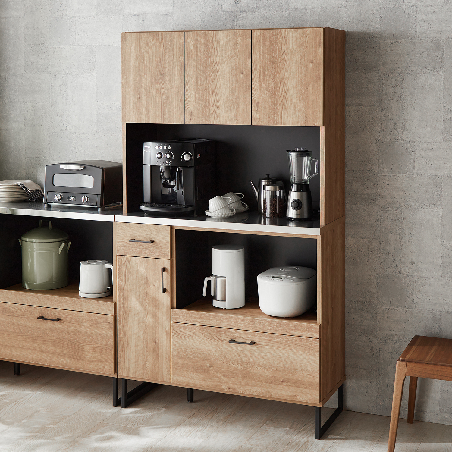 引出しと扉にたっぷりの収納力お掃除しやすい脚付きも魅力同じデザインのキッチンカウンターと並べておいても
