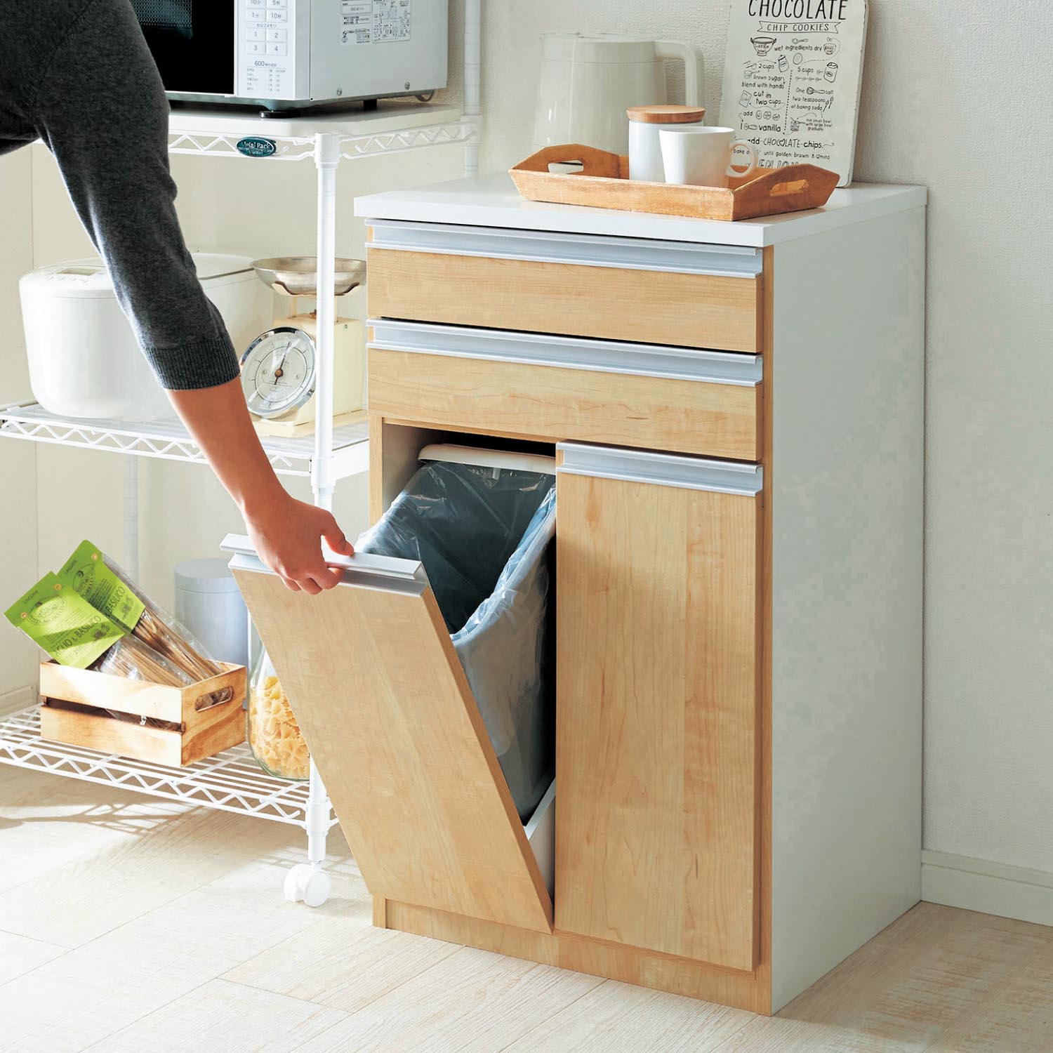 いちいちペールのフタを開閉する必要がなく、一つの動作でラクにゴミ捨てOKフタ付きペールなので臭いもれも防げます上段はゴミ袋やキッチン用品をしまえる引出し付き清潔感のある「ホワイト」と、木目調デザインの「ライトナチュラル」の2色展開