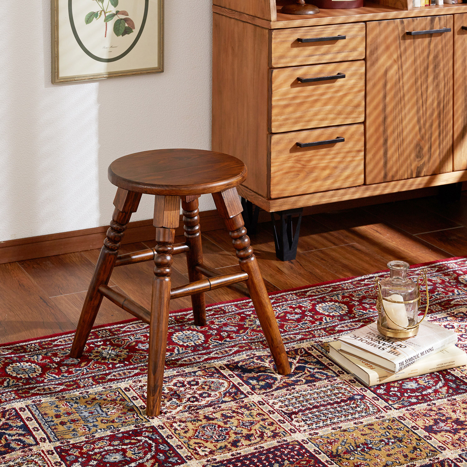 節やナチュラルな木目が映える、天然木パイン材でつくったスツールダークトーンのカラーで塗装をほどこし、落ち着いたアンティーク調に仕立てました脚部には上品なかわいらしさを感じさせるヨーロピアンテイストのあしらいをほどこし、デザインに特長をもたせています。コンパクトなサイズ感で、リビングやデスク周りなど、場所を選ばず活躍ナチュラルな風合いを生かしているので、シックなインテリアにも、大人かわいいカントリー調のお部屋にもよく合います。