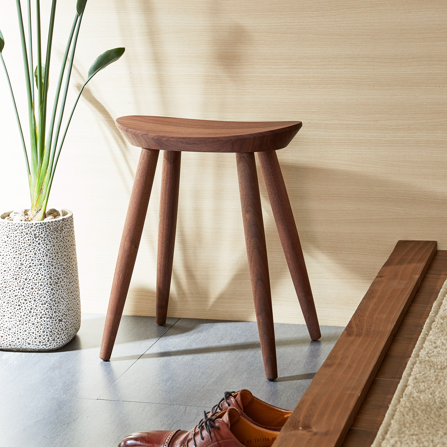 美しい木目とシックな色合いを持つウォルナットの無垢材で仕立てた、玄関にぴったりのコンパクトなスツール。座面の高さは、ちょっと腰掛けて靴やブーツを履くのにちょうどいい40cm反りの座面とふっくらカーブをかけた脚は細部まで美しく、安定感のある座り心地。ミニマムなサイズ感で、玄関でも場所をとりませんやわらかな曲線が目を惹く上品なフォルムと魅力的なブラウンカラーで空間に華を添えます。また、軽くて持ち運びしやすいので、お家のどこへでもサッと持ち運ぶことができます。