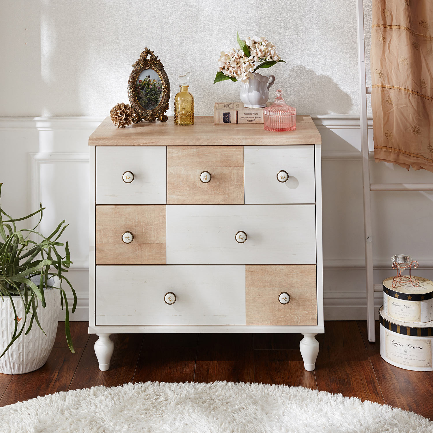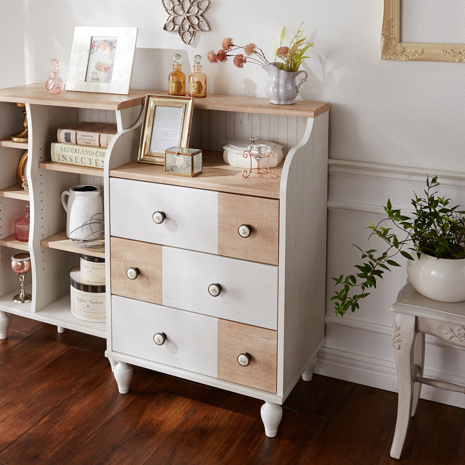 シャビーがかった質感がおしゃれなチェスト木目調とのツートンデザインを楽しめる愛らしいデザインです最上段は下着や靴下などの収納に便利な小引出しが3杯2段目、3段目はフェイクデザインの前板が特徴の幅広引出しになっています。スライドレール付きで開け閉めもラクラクエレガント・ガーリーな雰囲気を見せる脚部のあしらいもGOODシリーズのチェストやリビングテーブルとコーディネートするのもおすすめ