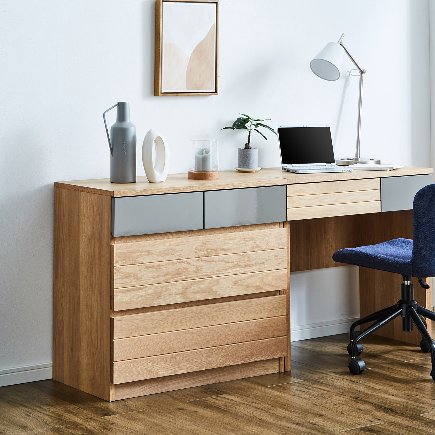 お部屋になじみやすいナチュラルの本体に、ワンポイントでグレーのエナメル塗装を施した前板を配置大小サイズの引出し2杯ずつで収納物の仕分けも行えます。取っ手なしのフラットなデザインシリーズのデスクやキャビネットと天板が揃うので、並べるコーディネートもおすすめ