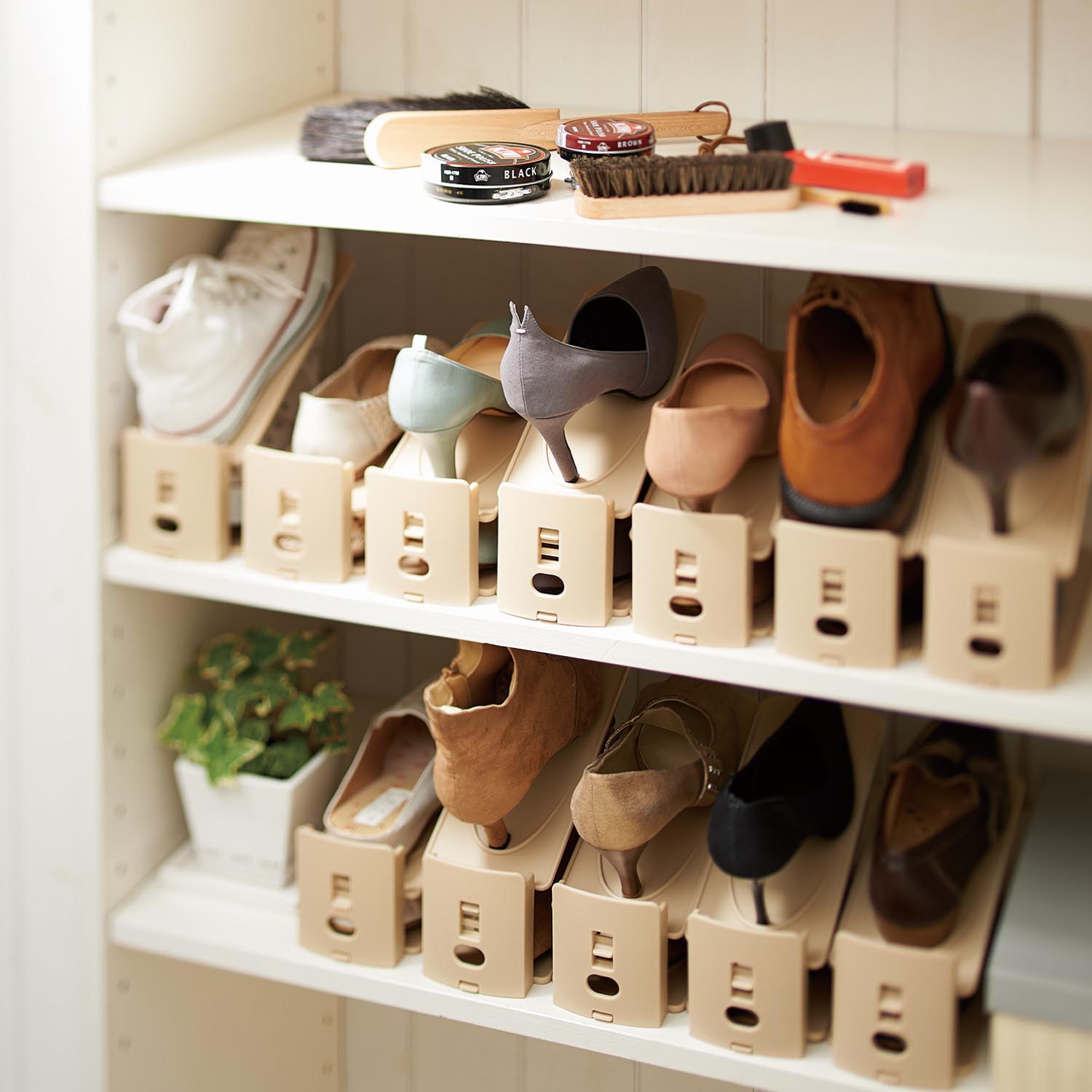靴箱のスペースを有効に使える靴ホルダー6個セットです靴の高さに合わせてトレイを差し替えるだけの簡単仕様ホルダー1つで靴を上下に収納できるので、通常の2倍の靴が収納可能になります。ハイヒールからローファーまで、靴の高さに合わせて3段階に調節OK引き出し用の穴が付いているので、片手でサッと取り出せます。靴のズレや本体前面への飛び出しを防ぐストッパー付きベージュとブラウンの2色から選べます。)