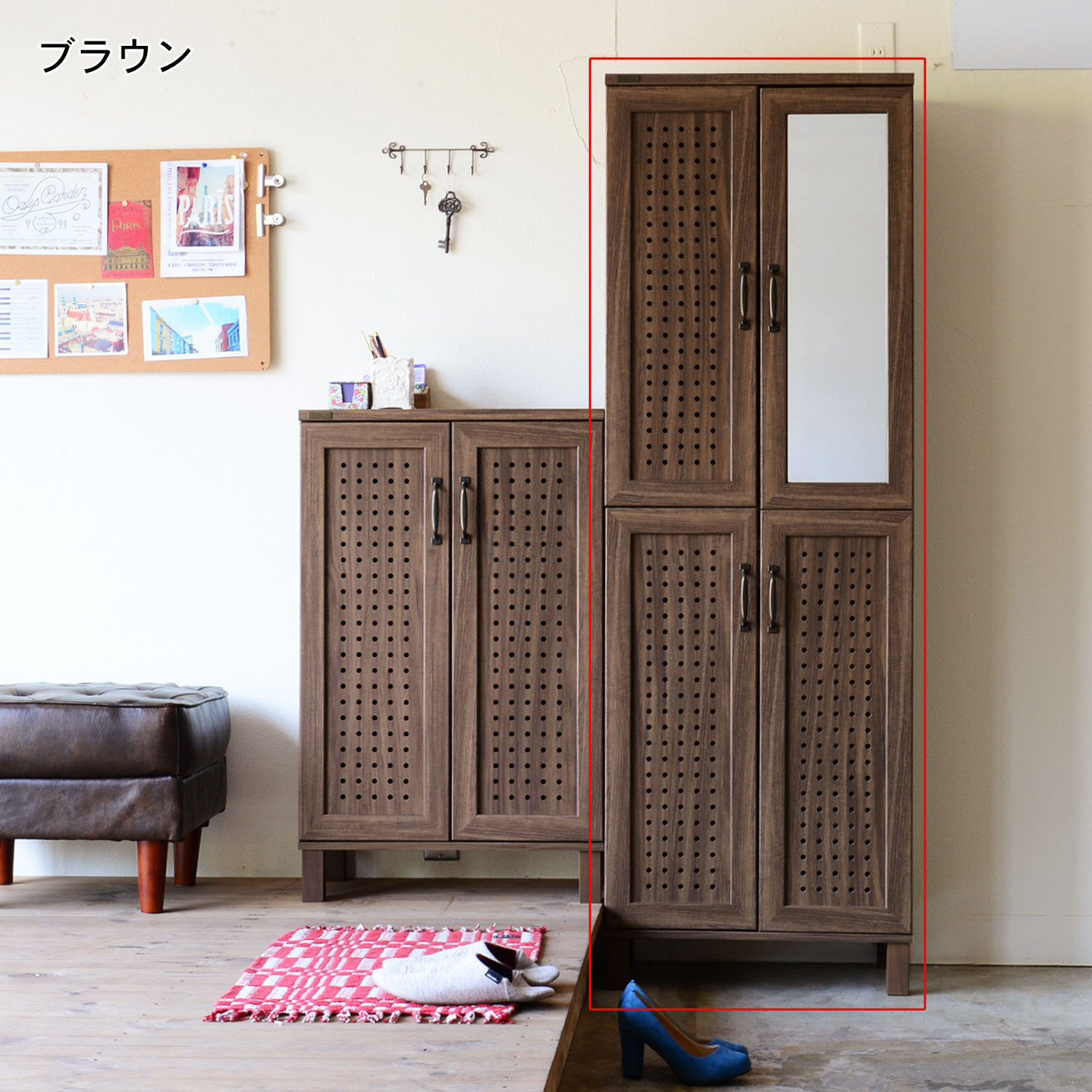 通気性とデザイン性を兼ね備えたパンチングデザインがGOOD木目調シートで玄関スペースにナチュラルな印象を与える、シンプルフォルムのシューズボックス。上部の扉片側にはミラー付きで、お出かけ前の身だしなみチェックができるのもうれしいポイント棚板は高さを調節できるから、パンプスやスニーカー、ロングブーツまでサイズを気にせず収納していただけます。カラーは3色からお好みでどうぞ)