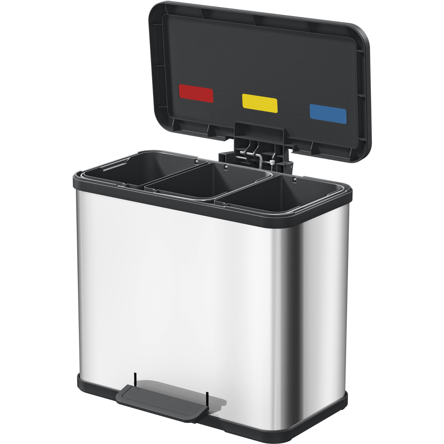 エコ先進国・ドイツ製のスタイリッシュなゴミ箱です外からゴミ袋が見えない設計で、キッチンに置いていてもインテリア性バツグン足踏みタイプなので両手がふさがっていても使え、フタはゆっくり静かに閉まります。内側のペールはハンドル付きでゴミ捨ても簡単機能的で容量たっぷりの3分別タイプ