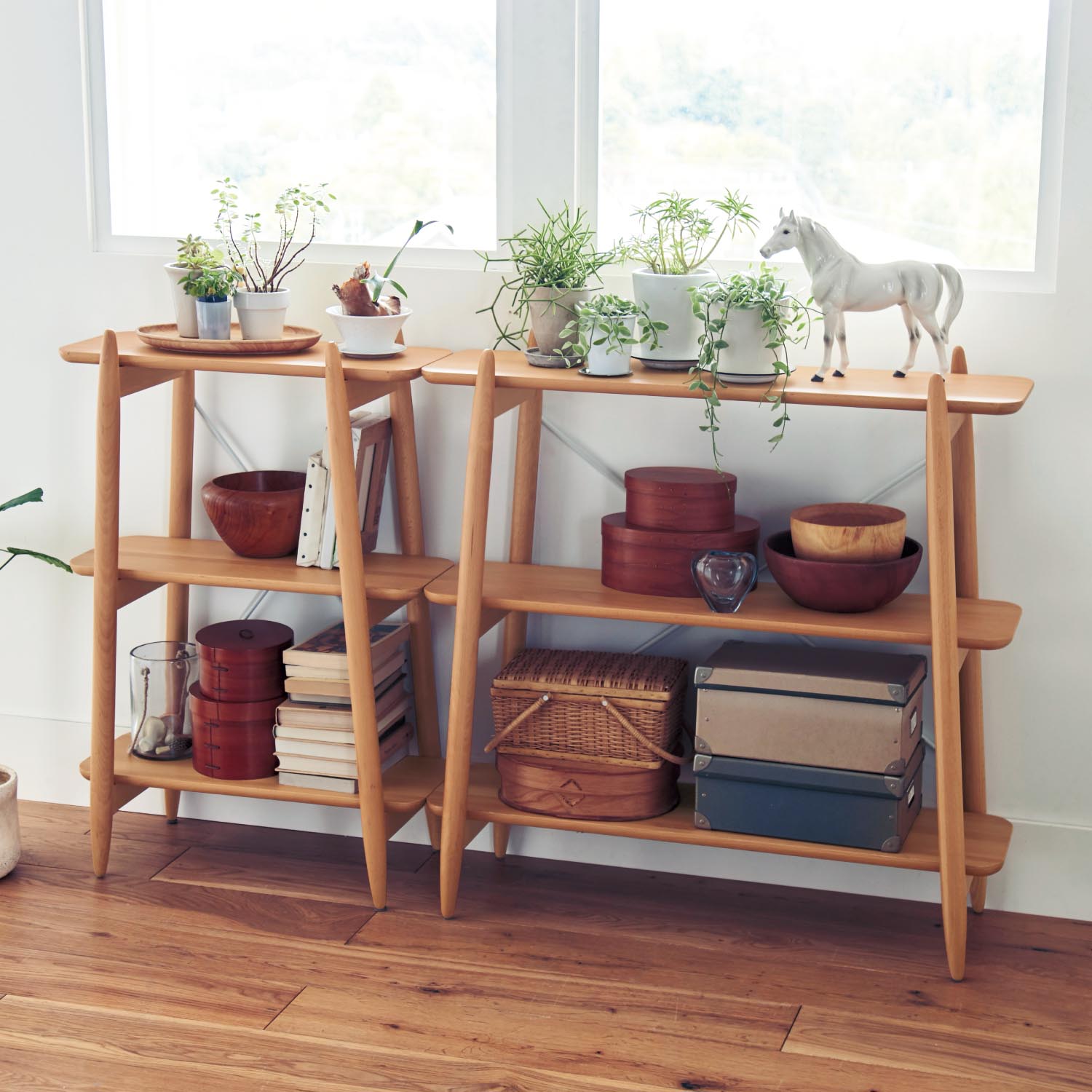 天然木のビーチ材をふんだんに使用角に丸みを持たせた棚板と先端を丸くラウンドさせた脚が、優しくすっきりとした雰囲気に収納した物がおしゃれに映えます。圧迫感の少ないデザイン各棚板はA4サイズが入ります。