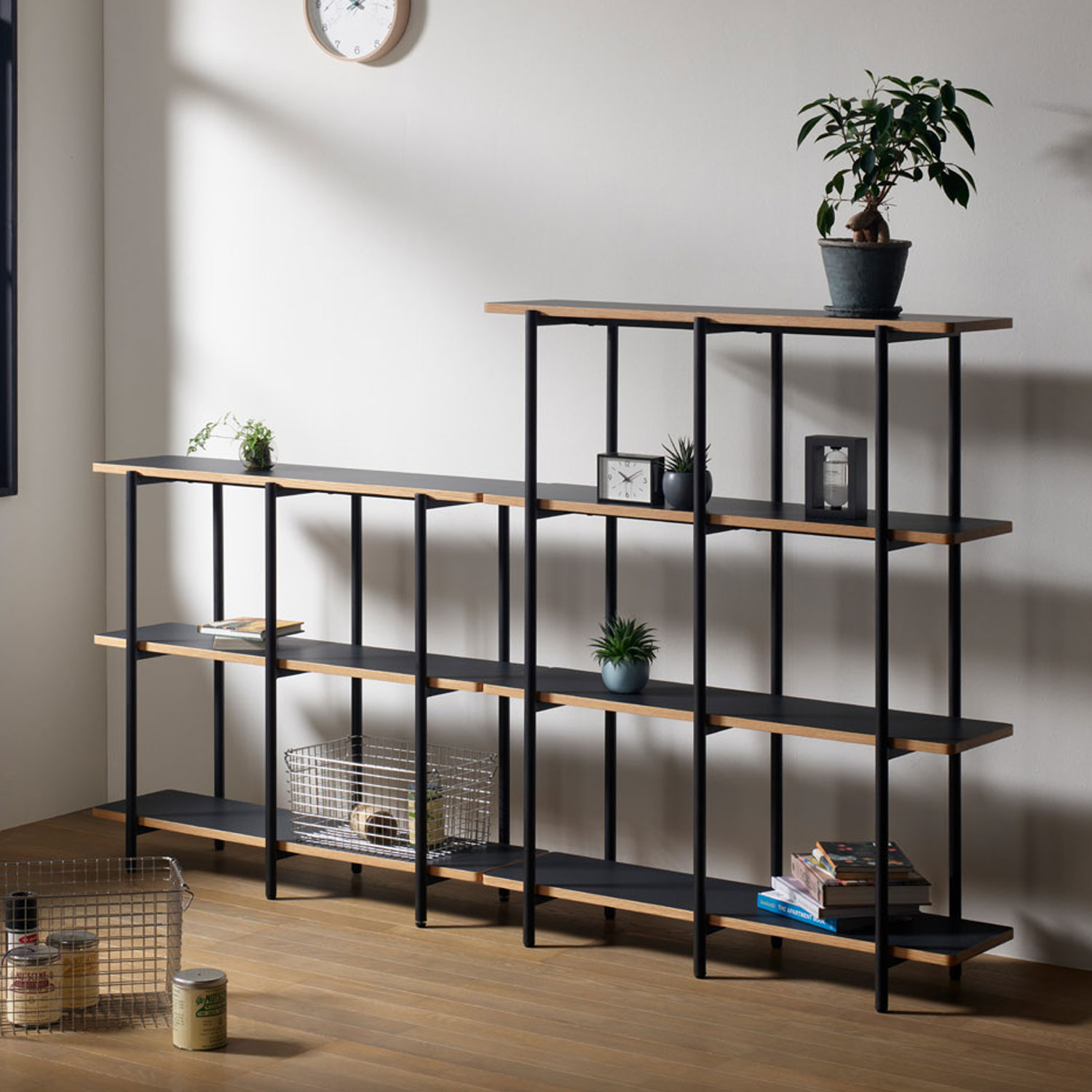 シンプルながら存在感のある、おしゃれなラックです棚板は傷にも強いメラミン樹脂を使用し、マットな黒の塗装でモダンに仕上げました棚板の縁にオーク材を貼り、ナチュラルなアクセントに奥行は浅めなので置いていても圧迫感が少なく、見た目もすっきりリビングに置いて、小物を飾りながら収納するのにぴったりです
