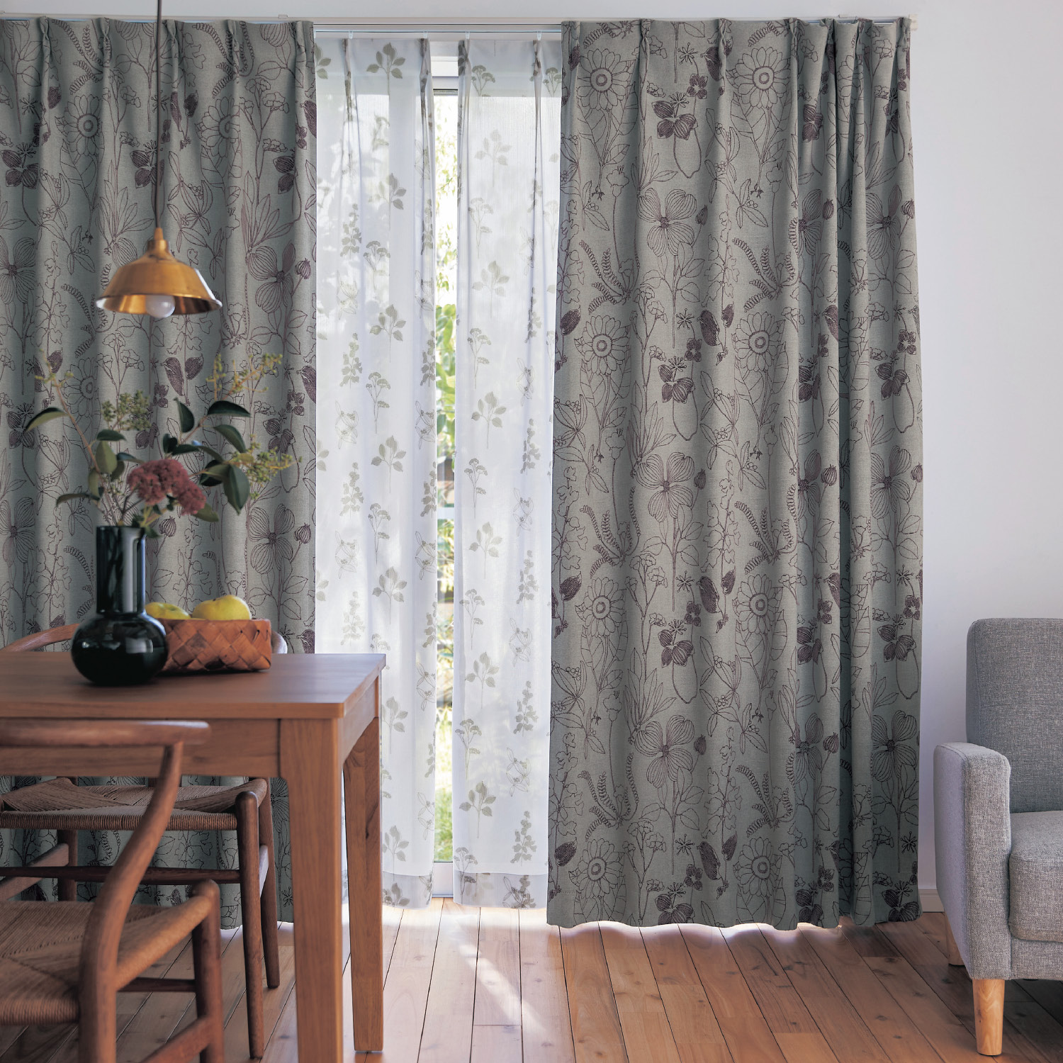 鳥やお花のモチーフをハンコ風タッチで描いたデザインと、線画や水彩画風タッチのボタニカル柄が大人っぽいデザインの2タイプから選べる厚地カーテンは2級遮光・遮熱機能付き薄地カーテンはUVカット・遮熱機能、明るい昼間に外からの視線を遮るミラー機能付きでお部屋を快適に保つ厚地カーテンと薄地カーテンが一度に揃い、ベストなコーディネートで統一感のあるお部屋に