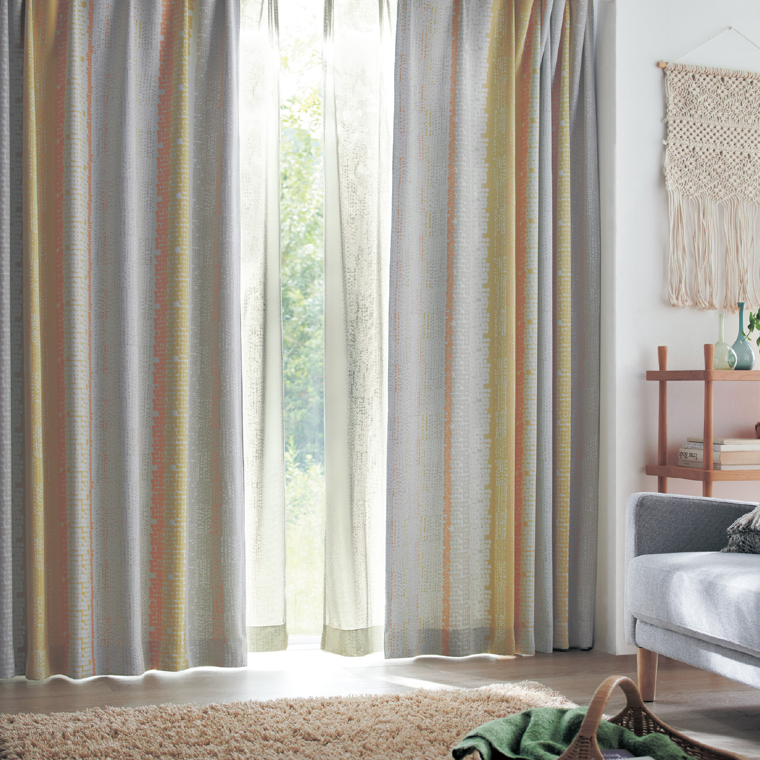 厚地カーテンは明るいイエロー系の色味で、2級遮光・遮熱機能付きシックなモノクロドットの薄地カーテンはUVカット・遮熱機能、明るい昼間に外からの視線を遮るミラー機能付きで快適厚地カーテンと薄地カーテンが一度に揃い、カジュアルテイストのコーディネートで統一感のあるお部屋に