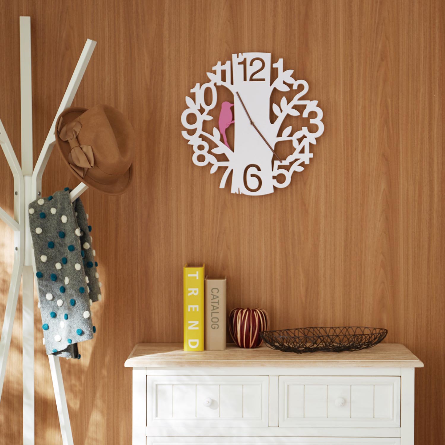 異国情緒ただよう神戸発のオリジナリティー溢れるインテリア・雑貨のブランド【INTERFORM】よりまるで絵本の中から飛び出してきたような、森の木に憩い集う小鳥たちがかわいい壁掛け時計小鳥の部分が振り子になっているので、さえずりダンスをしているような姿に癒されます)