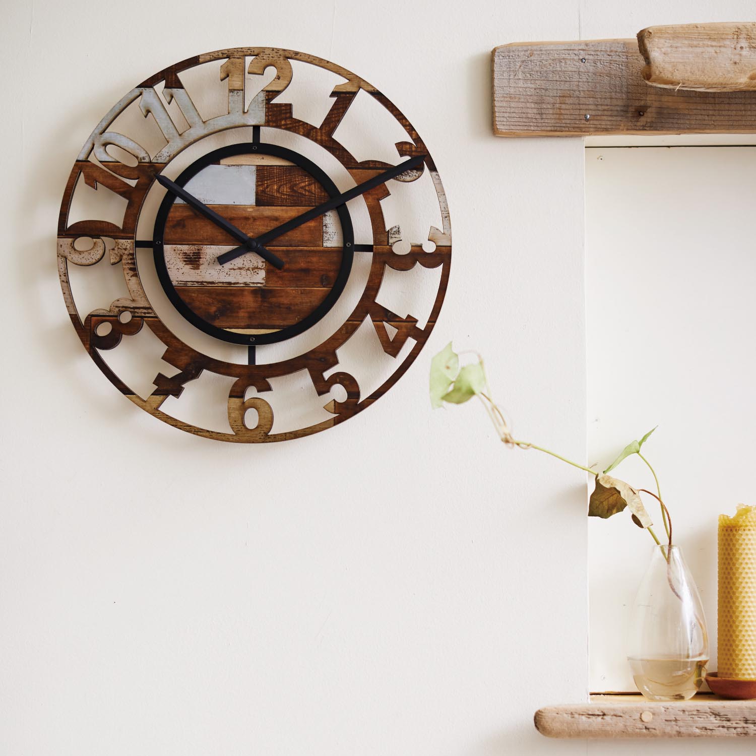 水車を思わせる大輪のフレームが存在感たっぷりレトロな雰囲気を漂わせる、古材を継ぎはぎしたようなシックな文字盤が印象的)