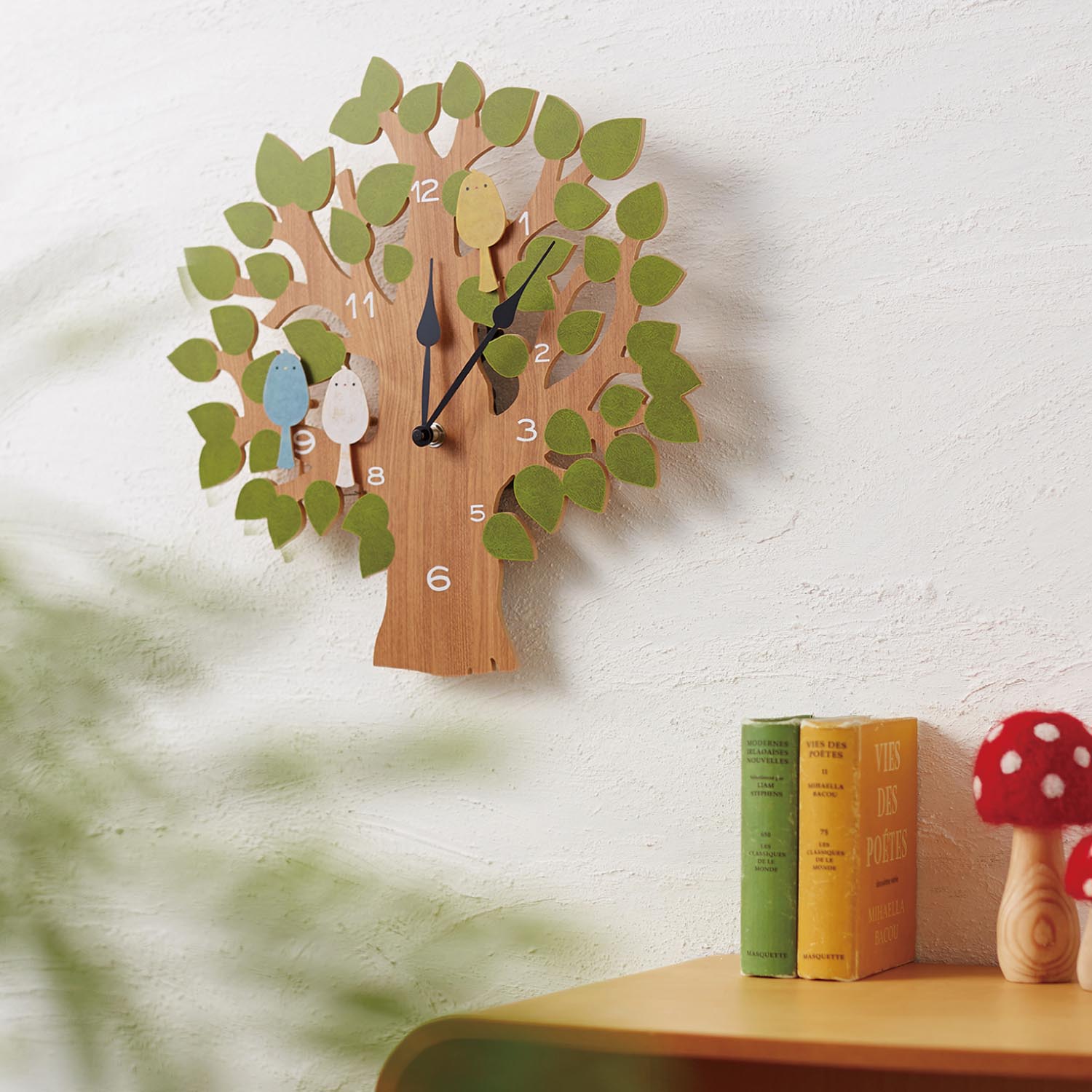 樹木をイメージしたナチュラルな雰囲気の文字盤に、アクセントカラーのキツツキがとまった愛らしいデザインキツツキは振り子になっているので、木をつつくようなキュートな動きが楽しめます)