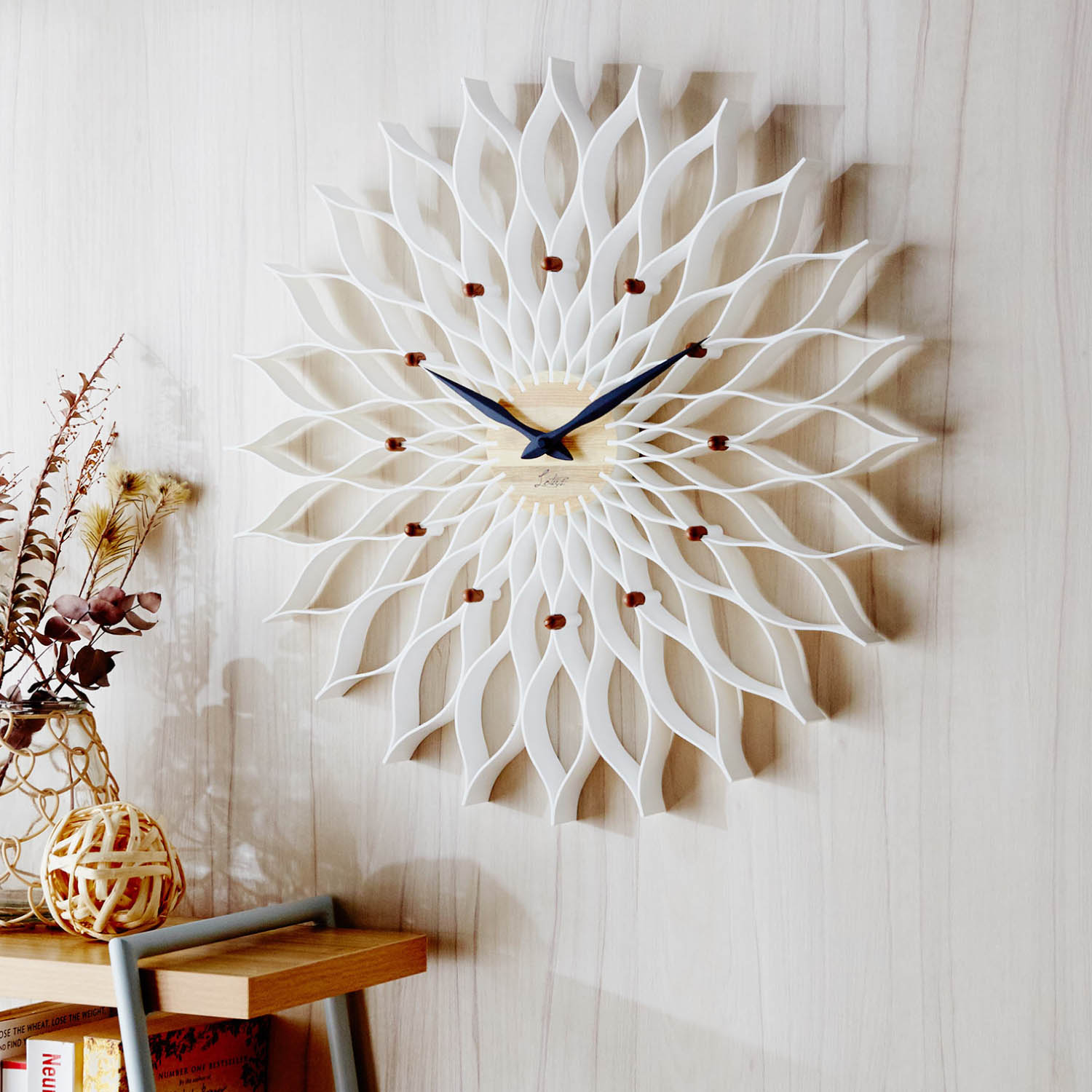 中央部分と針に使用したマットなスチールが、全体を引き締めるアクセント壁に映る文字盤の影も、おしゃれなムードを演出してくれます
