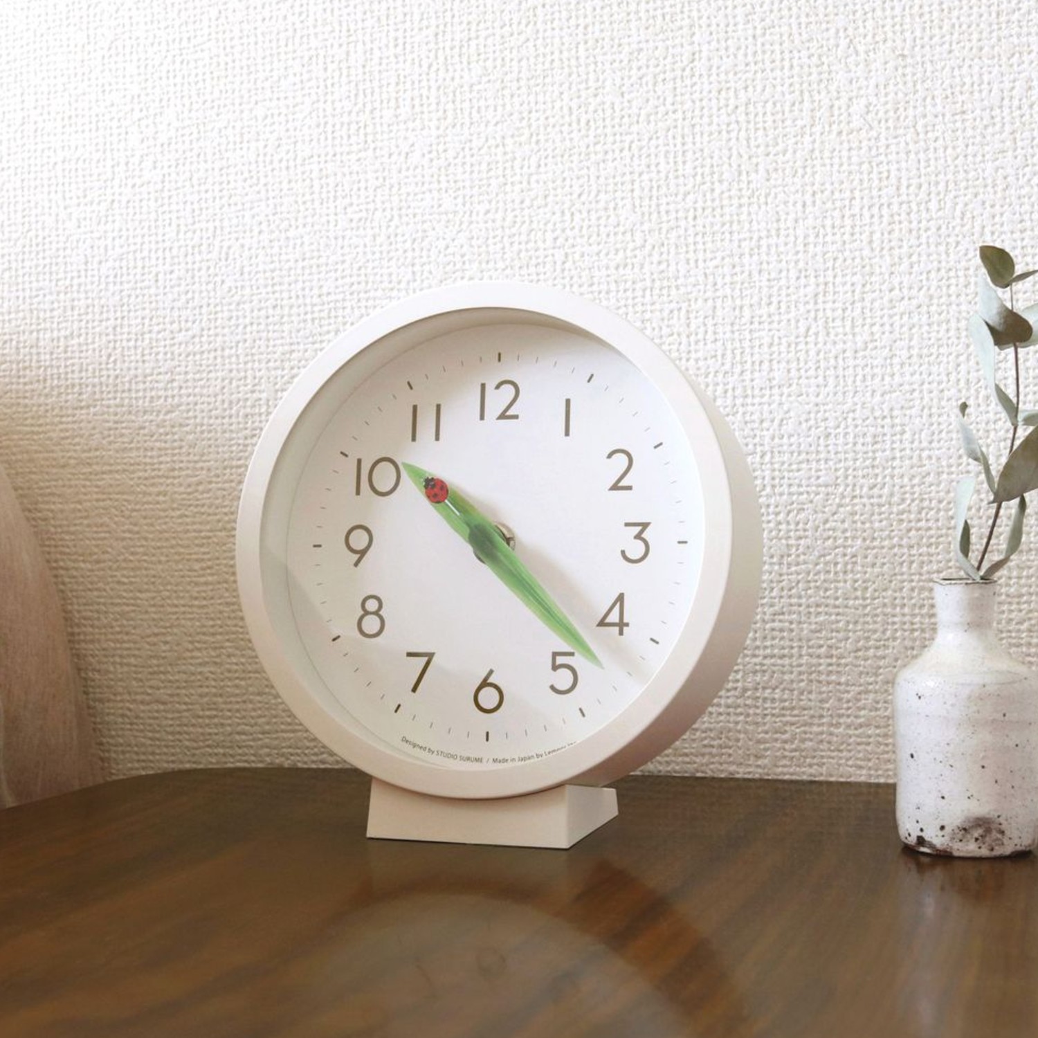 葉っぱとテントウムシを時計の針にデザインした、かわいらしい時計時計の針が交差するときに、テントウムシが葉っぱの上にとまっている様子が見ることができ、物語を感じます)
