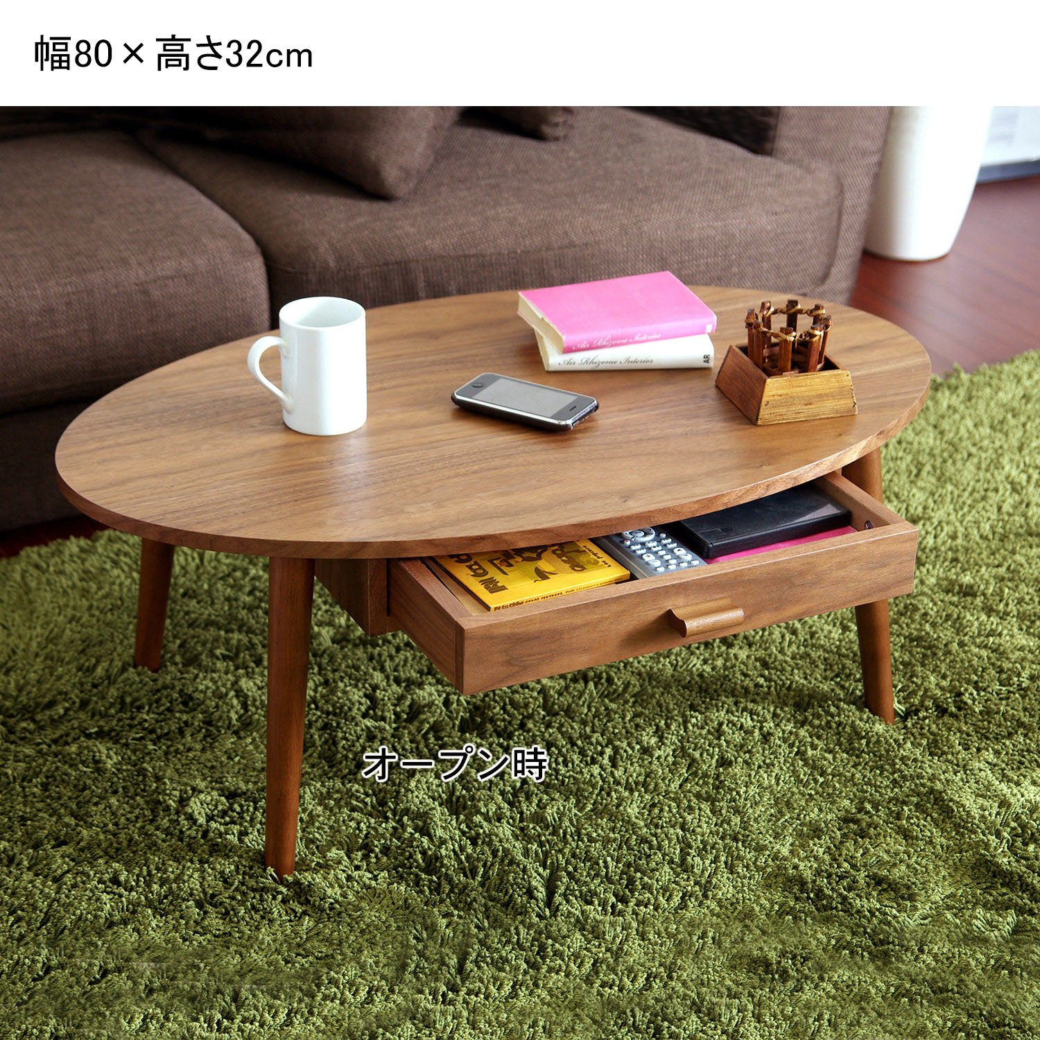 はっきりとした美しい木目が魅力のウォルナット材の突板を使用した、オーバルフォルムが素敵天板下に引出しを備え、リモコンなどの小物類を収納できるリビングテーブル。引出しは両側から引き出せるので、向かい合って座っても物が取り出しやすいのがポイント細身のテーパー脚が脚元を広く見せ、全体的にすっきりとしたつくりで仕上げましたスペースが気になるお部屋でも圧迫感なく設置OK引出しが1杯付いた「幅80×高さ32cm」と、2杯付いた「幅110×高さ38cm」の2サイズから、お好みでどうぞ)