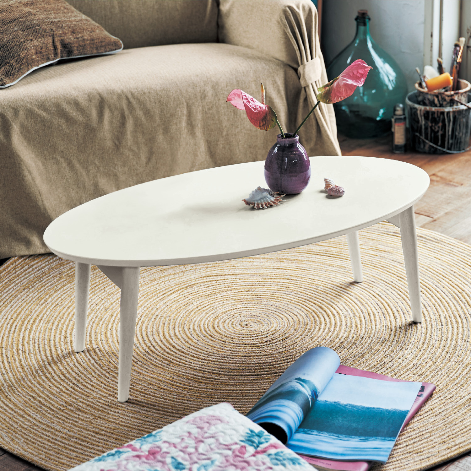 楕円形の丸みのある天板シルエットが上品で優しい雰囲気棚板のないシンプルなフォルムが美しいリビングテーブル。先に向かって細くなる木脚で全体の印象も軽やか脚部が折りたためるので使わない時はコンパクトに収納できる点も魅力狭いお部屋や一人暮らしの方におすすめ。カラーは3色)
