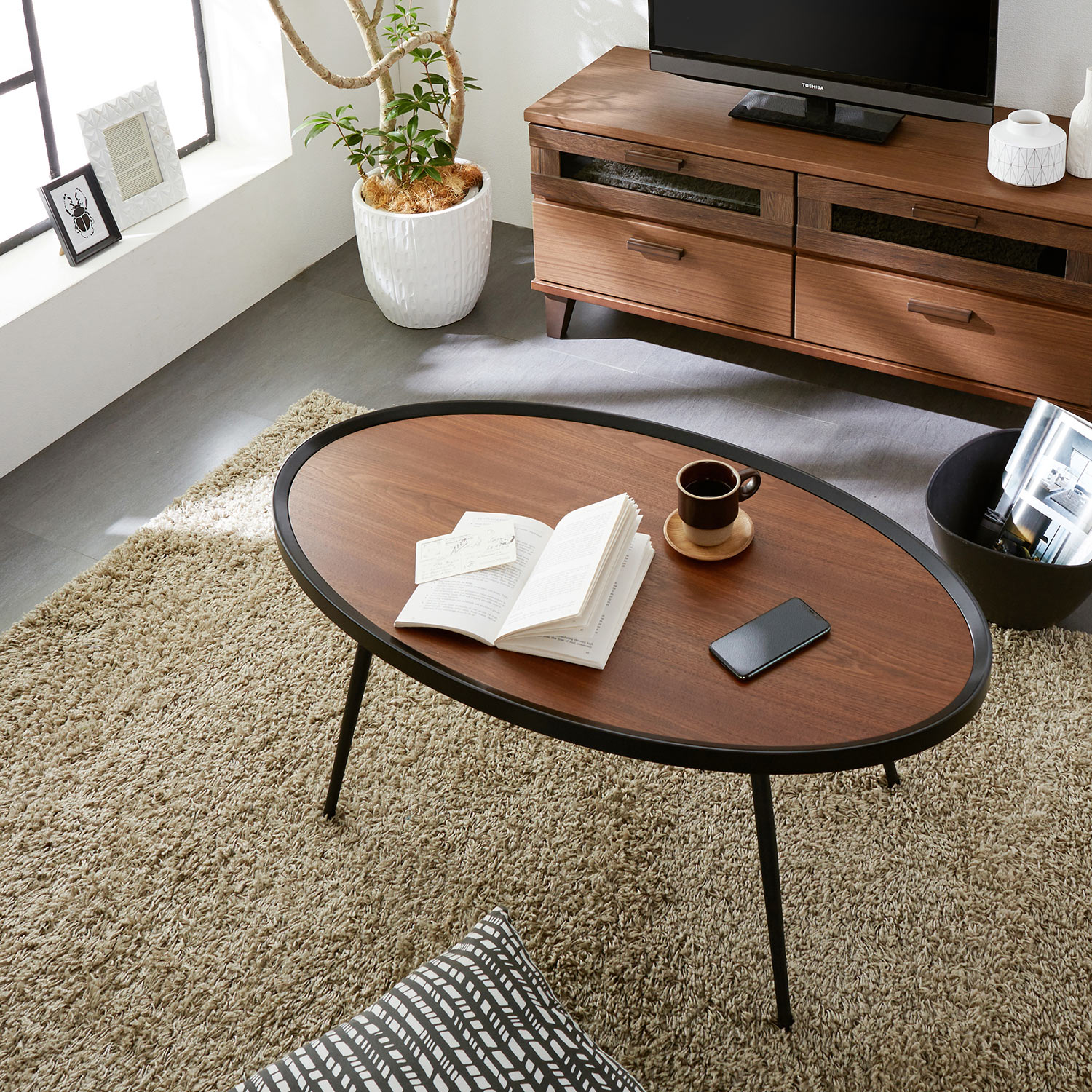 ウォルナット材の引出し付き楕円リビングローテーブル