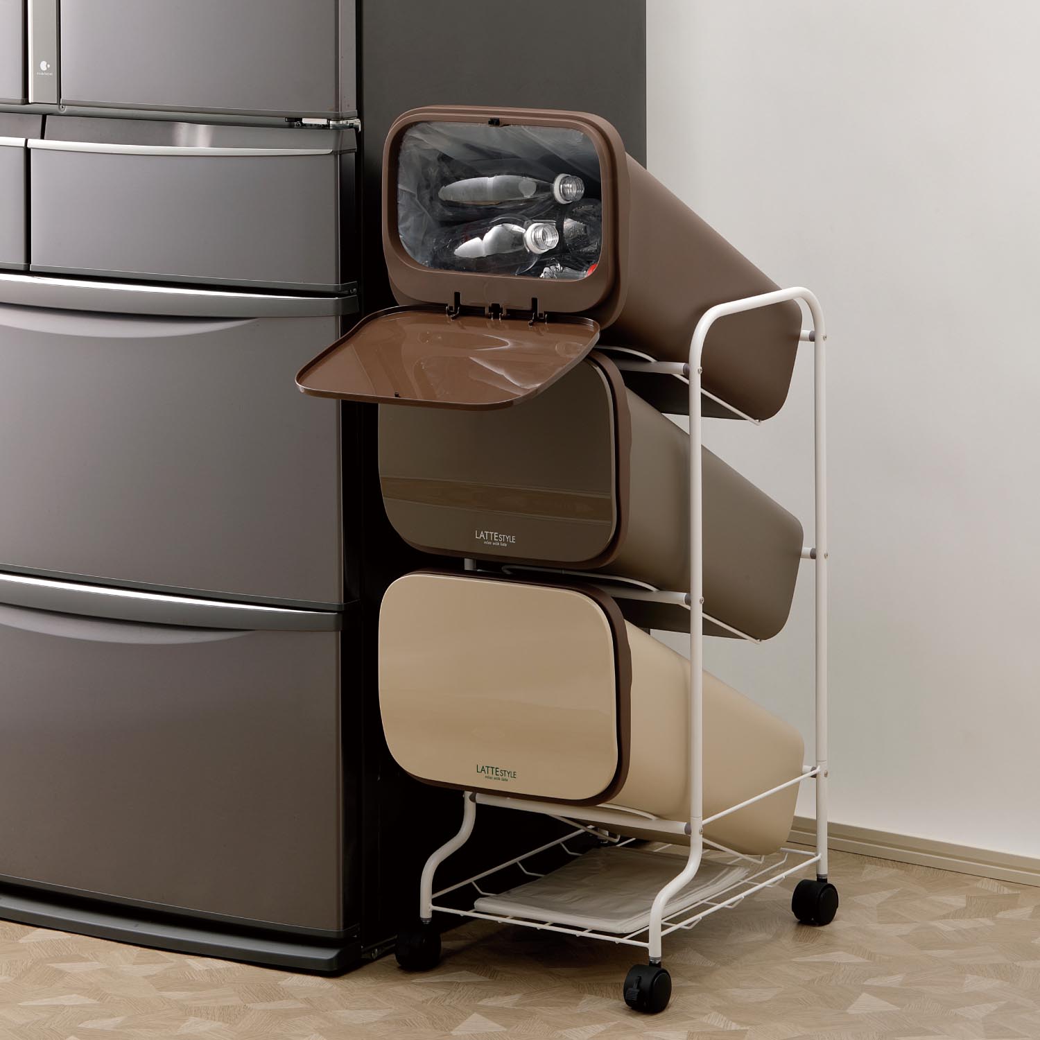 限られたスペースにすっきりと置ける、積み重ねて使う分別ダストボックスです冷蔵庫など隙間にも収まる幅34cmのスリム形状ワンプッシュで開くフタ前面のフラップは、高級感のある光沢仕上げ凹凸がないためお手入れが簡単にできます。カフェをイメージした暖かみのあるカラーで、キッチンやリビングなど様々な場所で幅広くお使いいただけます。ゴミ袋の保管に便利な網棚、移動に便利なキャスター、袋止めリングが付いているのもポイント