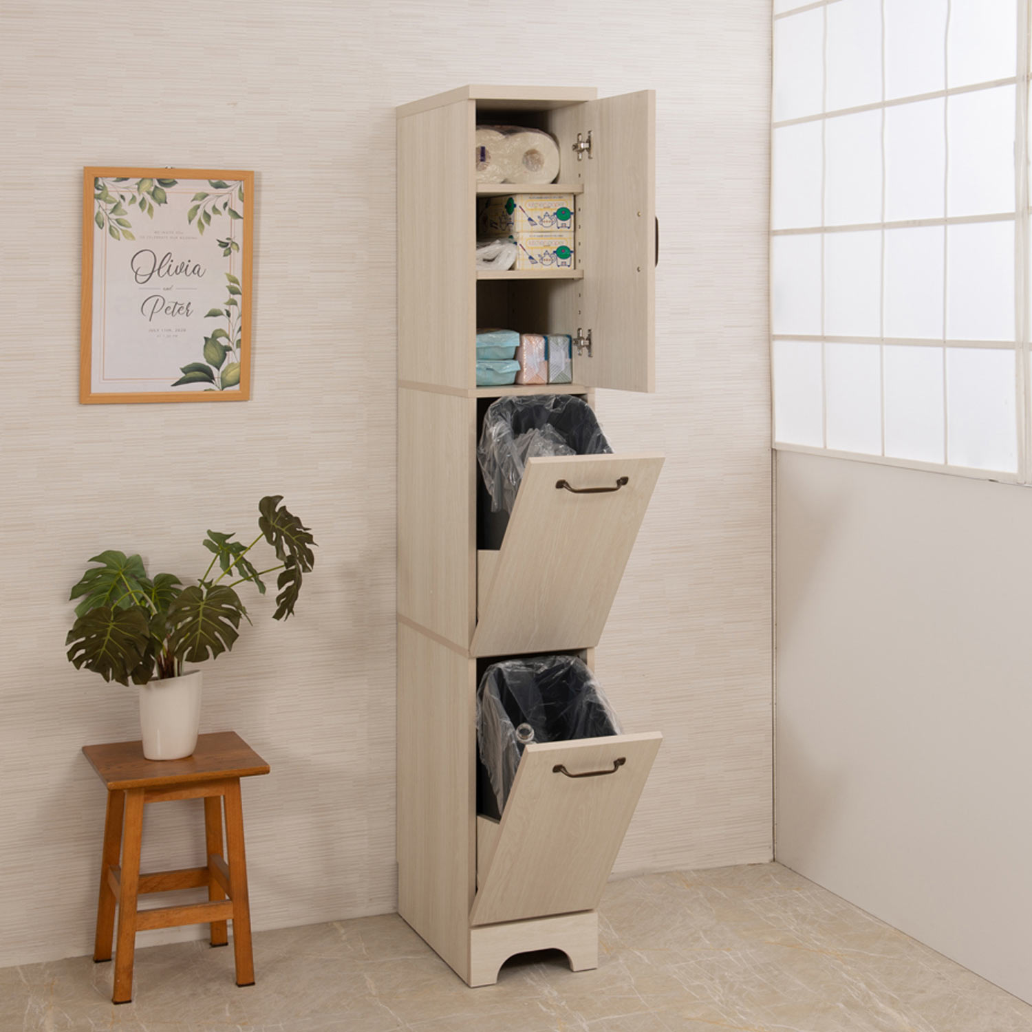 やさしい色味と木目調デザインがおしゃれなダストボックスシンプルナチュラルな佇まいは、幅広いインテリアにしっくりと馴染みます。狭い部屋でも置きやすい、幅わずか25cmのスリムサイズ上部の扉内には食器などの収納もOK上扉は左右開きどちらにも対応可能。下2段はフラップ式で開閉しやすく、扉はニオイを抑えゴミ箱に見えない見栄えも◎。