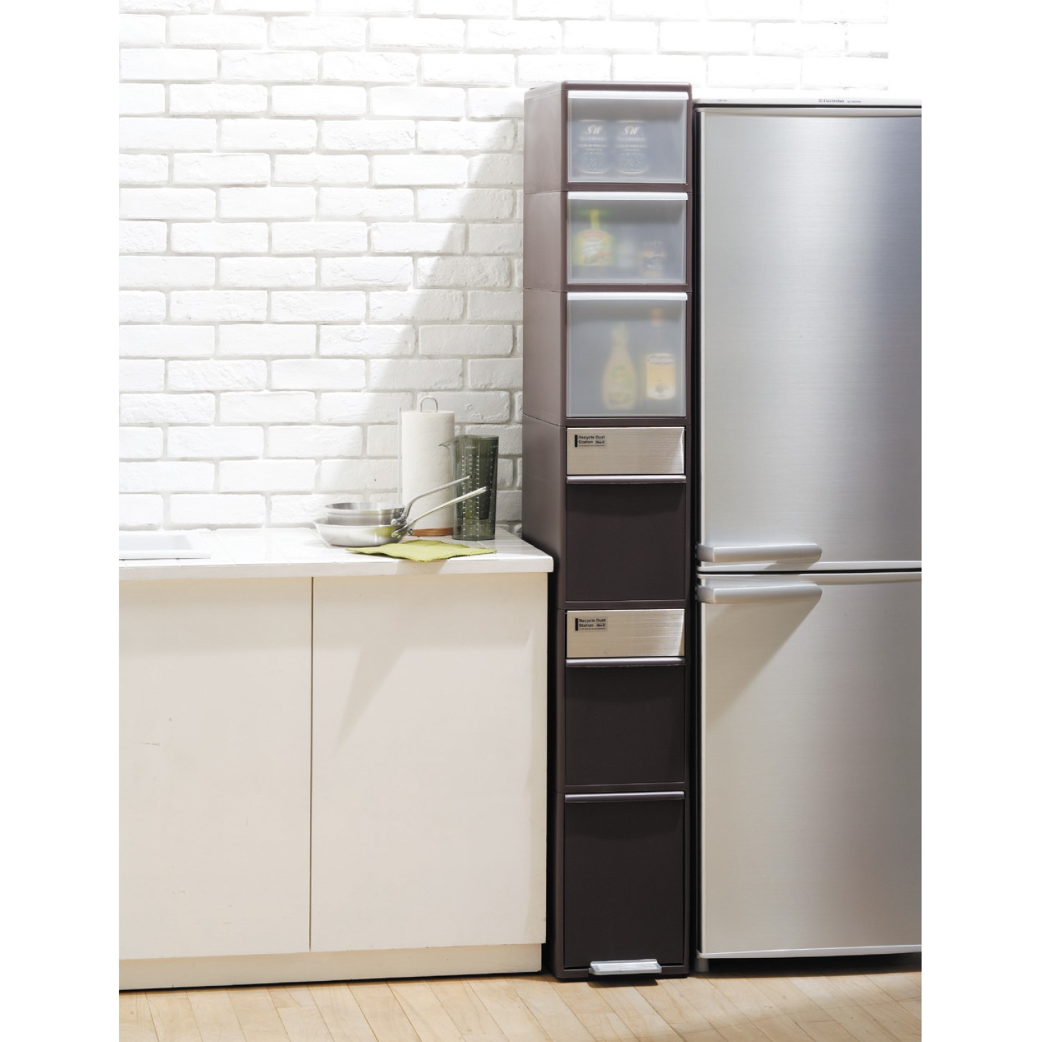 幅は25.5cmとスリムなので、キッチンボードや冷蔵庫との隙間にスッキリと収まります。ゴミ箱の上部空間を活かし収納とゴミ分別を両立できるマルチタイプ上3段の収納ユニットには、500mlペットボトルやスナック菓子、乾物、レトルト食品、缶詰等がストックできます。下3段は分別ゴミ箱として、細々とした分別ゴミを1か所にまとめられます。ゴミ箱ストッカー内部には持ち手付きポリ袋を掛けられる引っ掛け付きステンレス製のスイングパネル付きで捨てる際中身が見えにくく高級感ある佇まい最下段はぺダル式なのでかがまずゴミが捨てられます。