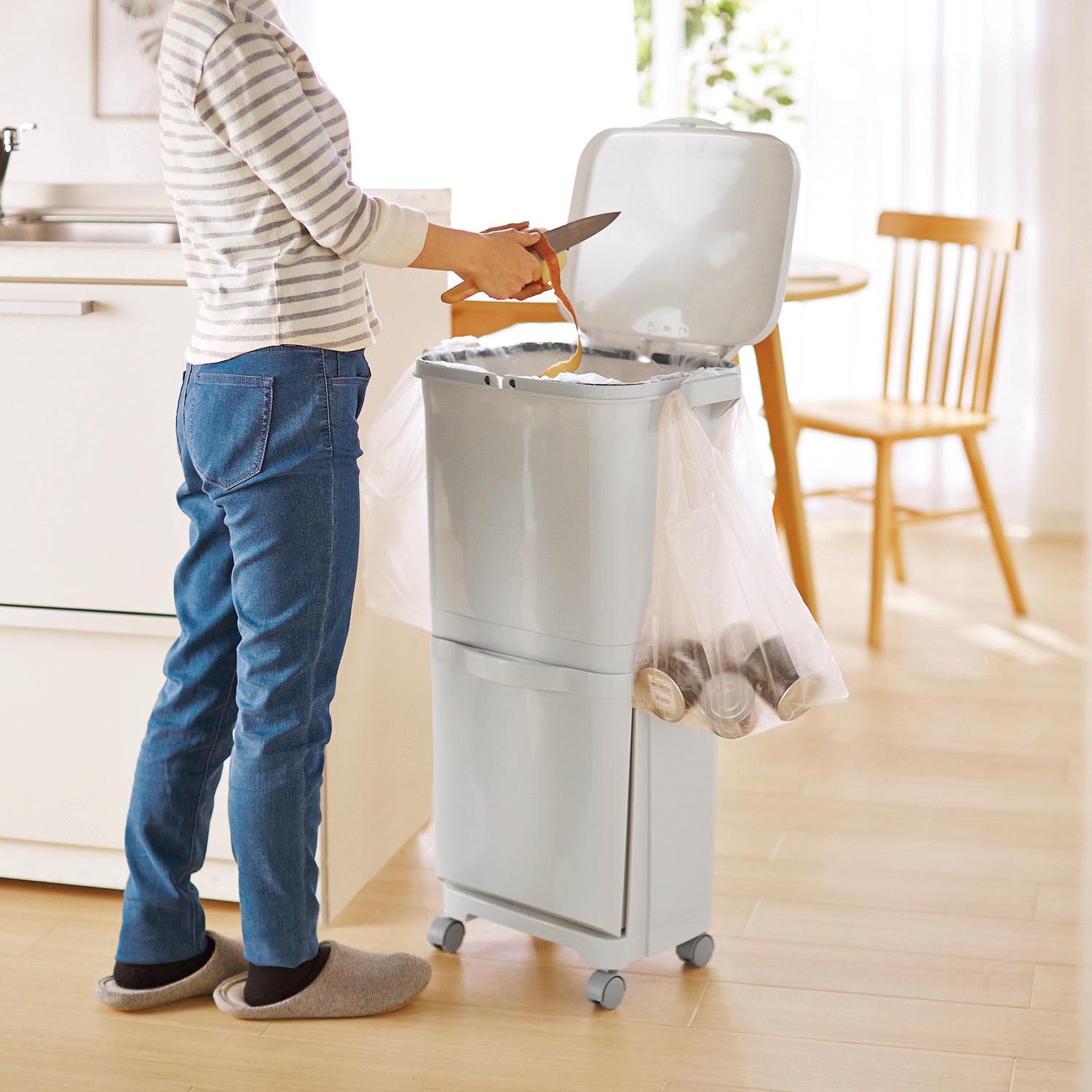 場所をとらずすっきりと置ける縦型のゴミ箱上段が容量30L、下段が15Lの2分別タイプ両サイドのフックにレジ袋を掛けられ、ゴミの分別もさらに細かくできます。キャスター付きなので掃除の際も移動が簡単調理中は調理台横に動かすことができ、生ごみもサッと捨てられて便利インテリアを損なわないシンプルなデザインも魅力です