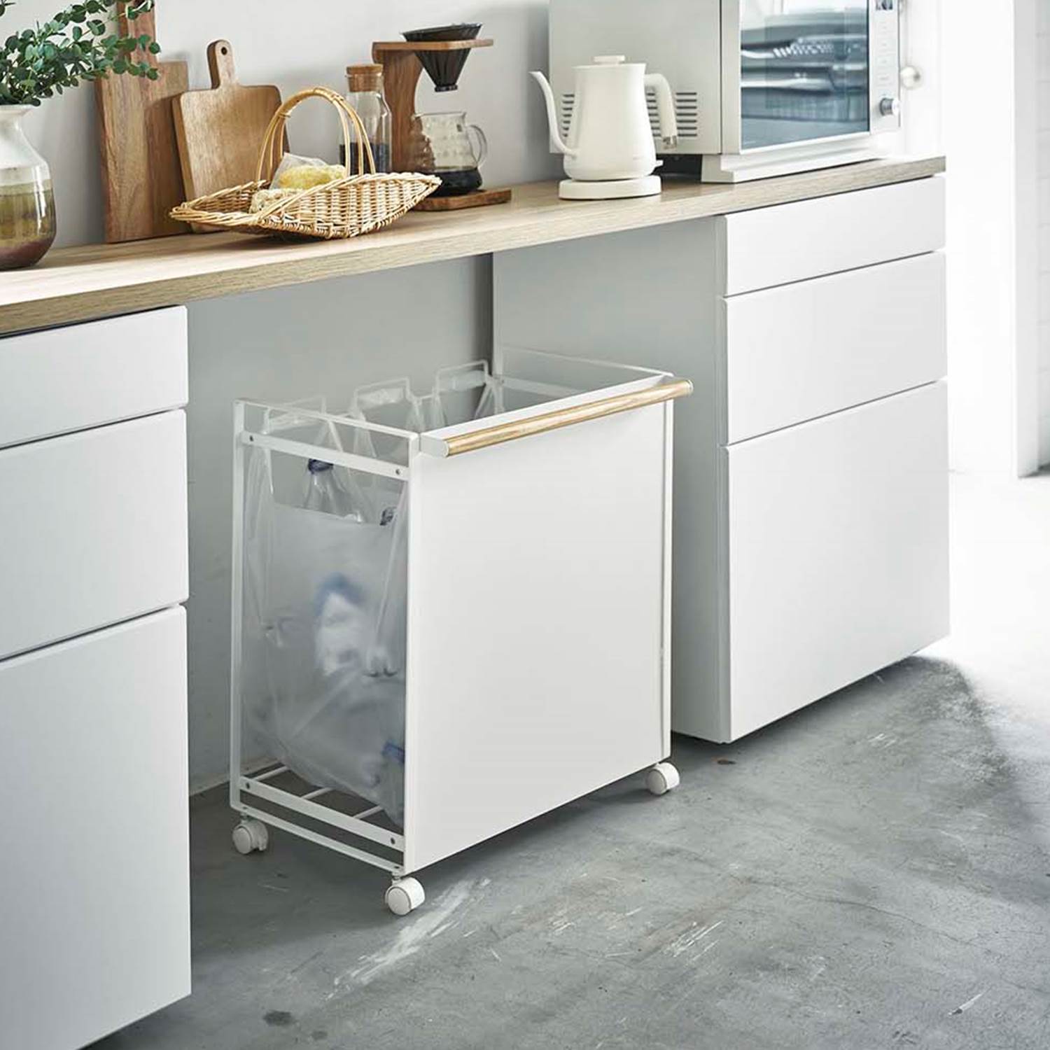 レジ袋を隠して分別できるスタイリッシュなゴミ箱レジ袋を引っ掛けるだけのシンプルな構造底面にはレジ袋のストックを収納できます。ハンドルとキャスターが付いているので、お掃除などの際も移動がスムーズスペースや用途に応じて、2分別と3分別の2タイプから