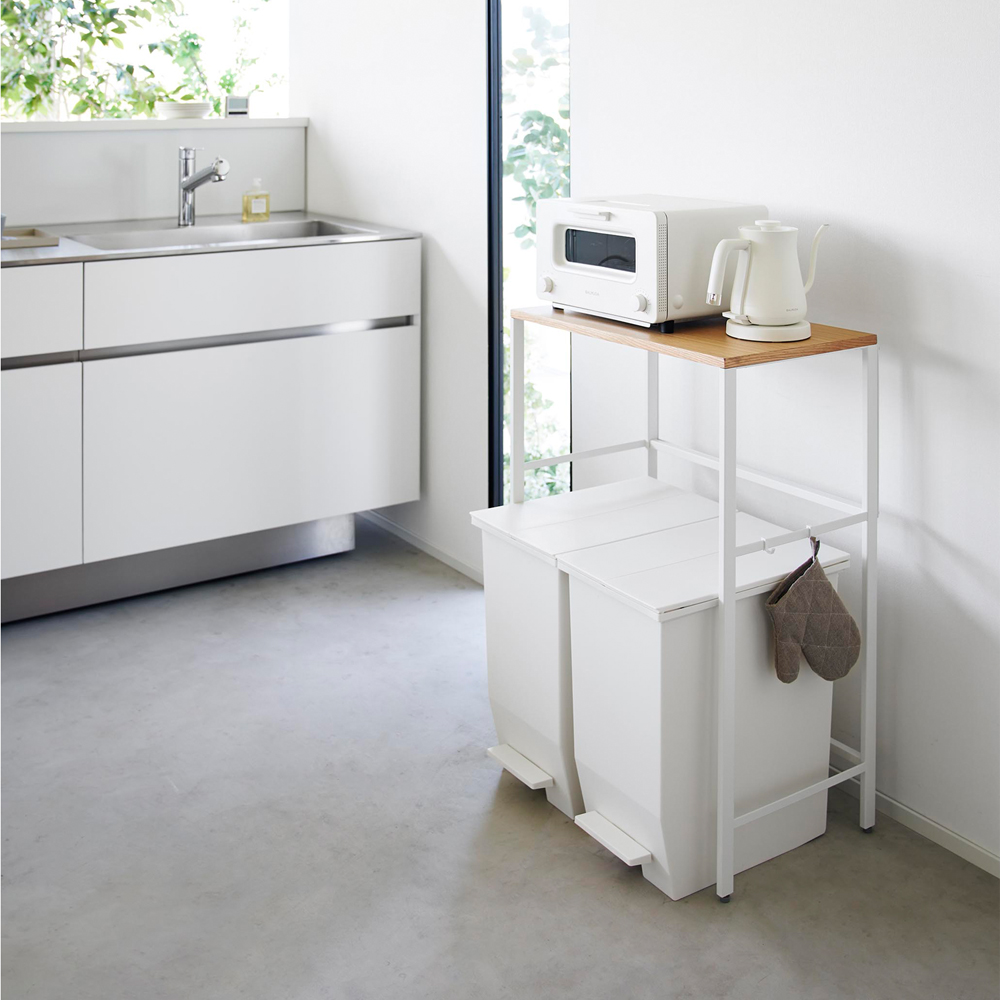 ゴミ箱上のデッドスペースを有効活用し、キッチンをすっきりとした印象に仕上げるラック床から天板まで83cmの設計で、フタ付きや両開きペダル式のゴミ箱もスッキリ収納可能天板は20kgの耐荷重量があるのでキッチン家電の置き場にぴったり天然木の突板仕上げの天板とマットなスチールフレームが調和した洗練されたデザインで、どんなキッチンにもフィットサイドフレームに付けられる着脱可能なフック付きシックでおしゃれなホワイトとブラックの2色展開