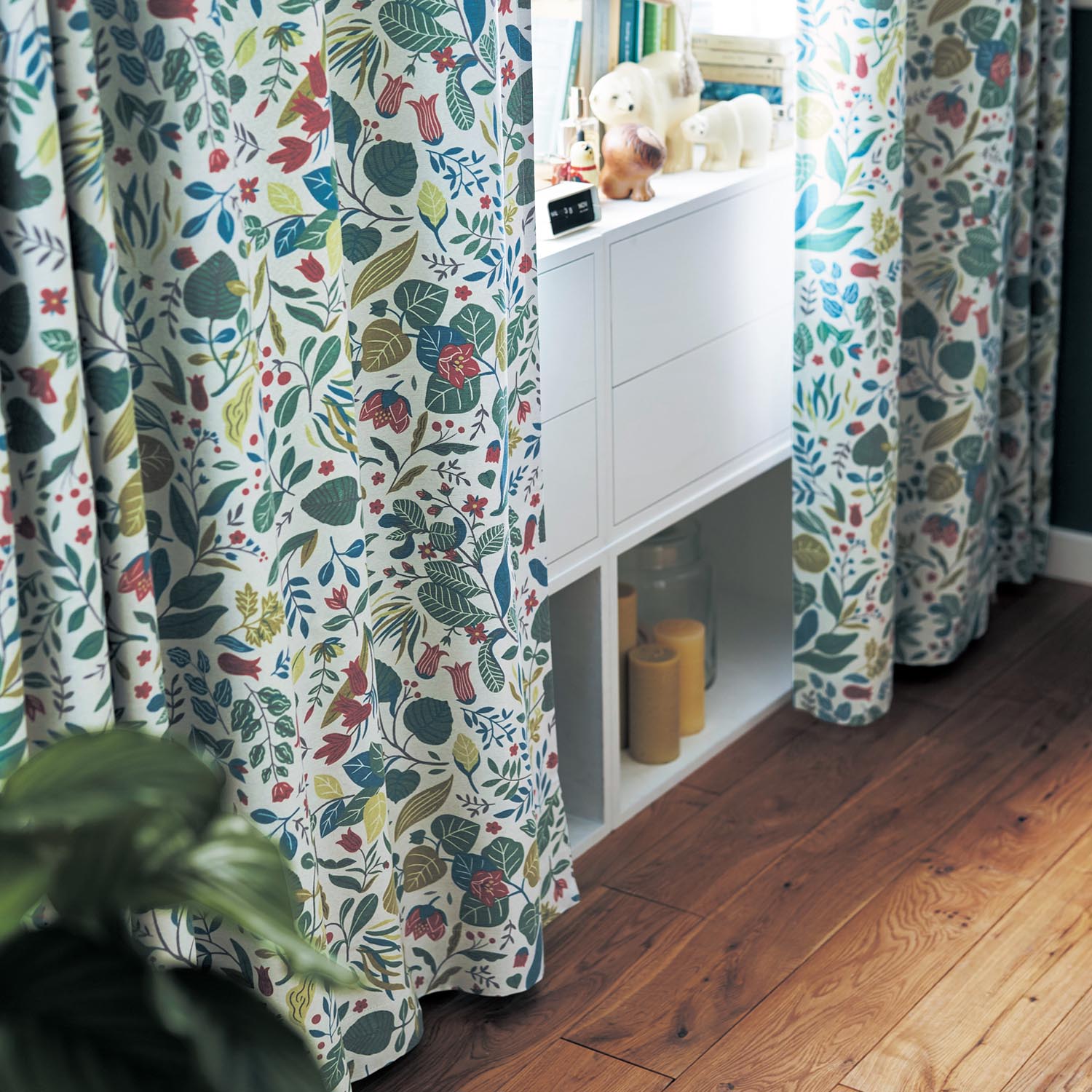 色鮮やかに描いた、細かな植物柄綿糸を使って織り感を出し、ナチュラルな雰囲気に仕上げました眩しい光を遮る効果のある2級遮熱機能、外からの熱を防ぐ遮熱機能付き、保温効果もあり【光を遮る 2級遮光】?室内が暗くなるが、隣の人の顔や表情は識別できるレベル? 2級遮光カーテンは、室内の様子をわかりにくくしたい方、朝日や強い西日を和らげたい方におすすめ)