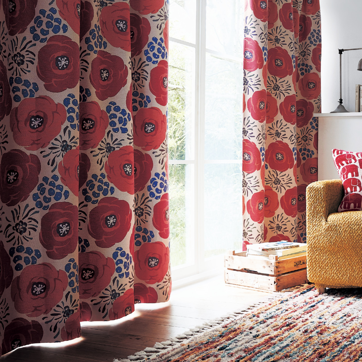 色使いが新鮮な花柄モチーフのカーテン明るい色使いだけどトーンを抑えているので、甘すぎず大人っぽい印象)