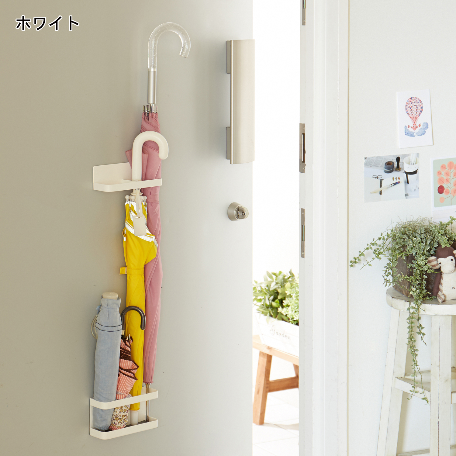 玄関スペースをできるだけ広々と使いたい、そんなお客様の声にお応えするのが、強力マグネットで装着するタイプのコンパクトな傘立てデザインは、いたってシンプル折りたたみ傘ならこのままストンと置くだけ長傘ならサイズに合わせ2つのパーツを動かして調節もできます。ホワイトとブラックの2色から