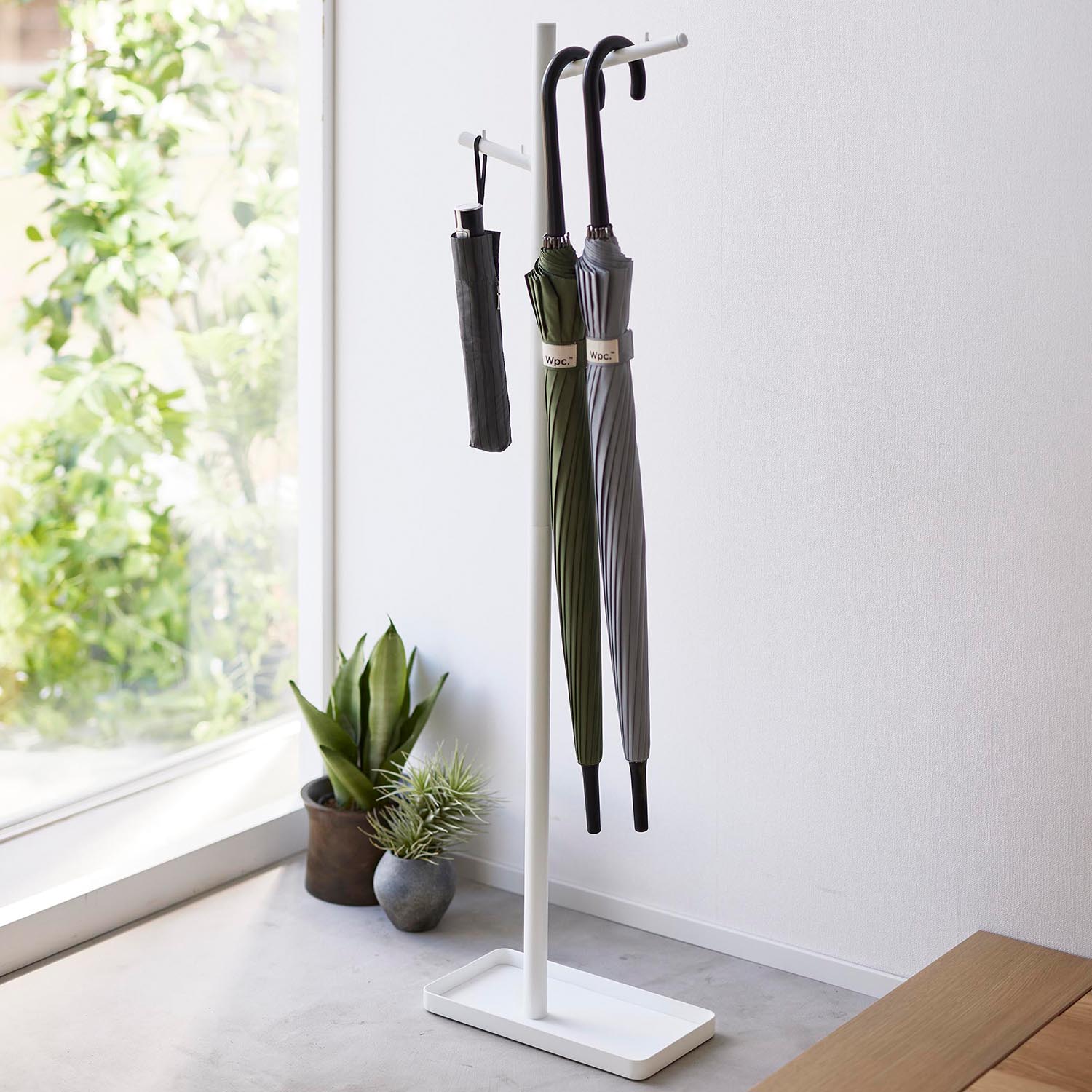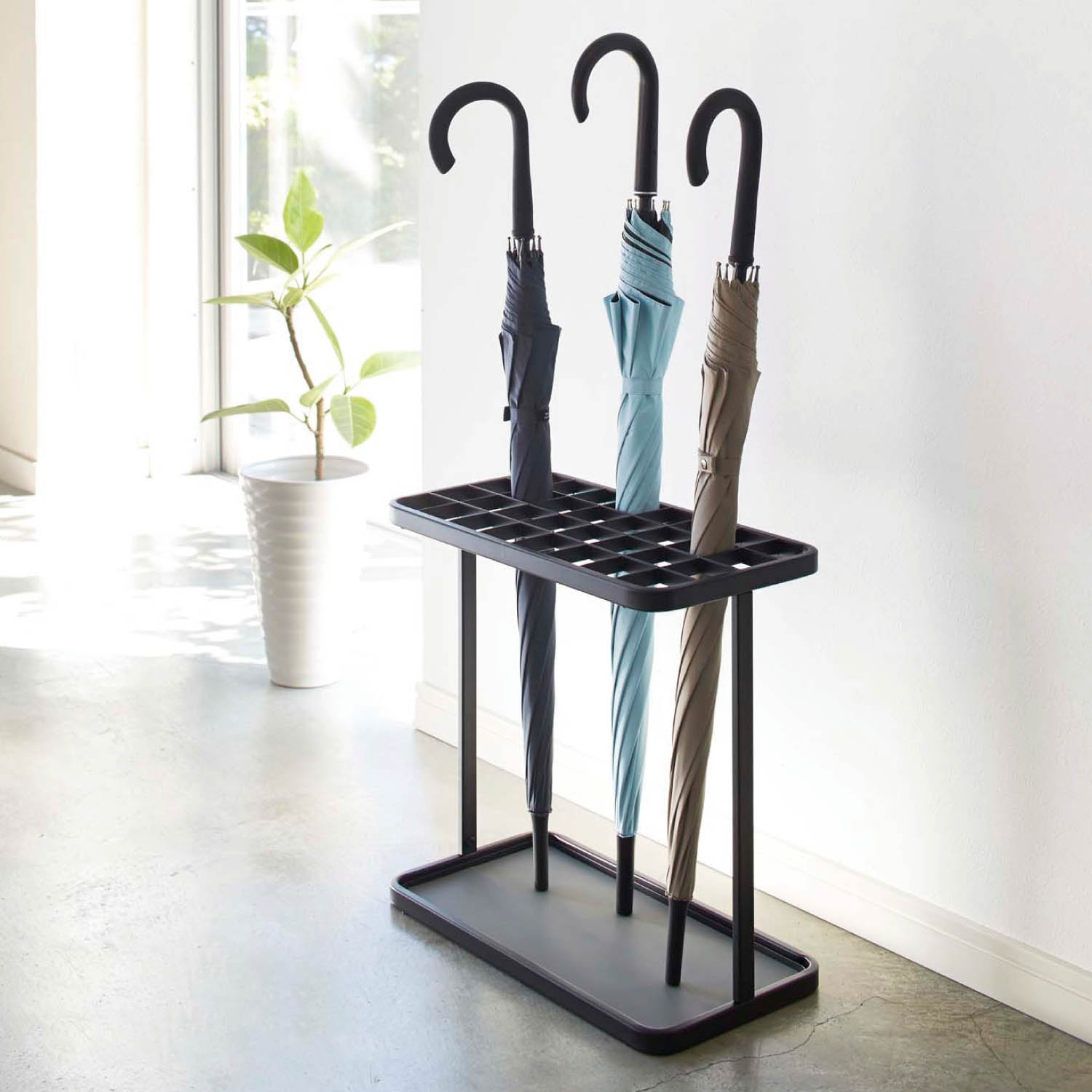 傘を引っ掛けるだけの簡単収納。場所を取らないスリムなデザインです。傘の長さに合わせて高さ違いでの収納が可能。