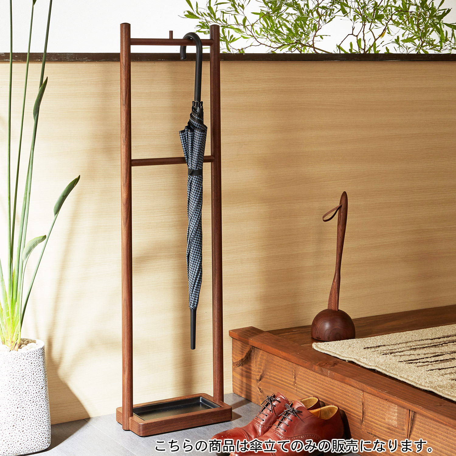 天然木やその端材を大切に使い、製造から研磨作業までを丁寧に手がける北海道・旭川の家具メーカー「cosine(コサイン)」より美しい木目とシックな色合いを持つウォルナットの無垢材で仕立てた傘用のラックシンプルなデザインに素材感が映え、上質な雰囲気をただよわせます。バーには長傘を、中央のフックへは、折りたたみ傘などを掛けておくことができます。壁際にすっきり置けるスクエアな形とミニマムなサイズ感で、玄関でも場所をとりません魅力的なブラウンカラーで、スタイリッシュな玄関に華を添えます。底面のトレイは取り外して水を捨てることができるので、いつでも清潔に使えます。