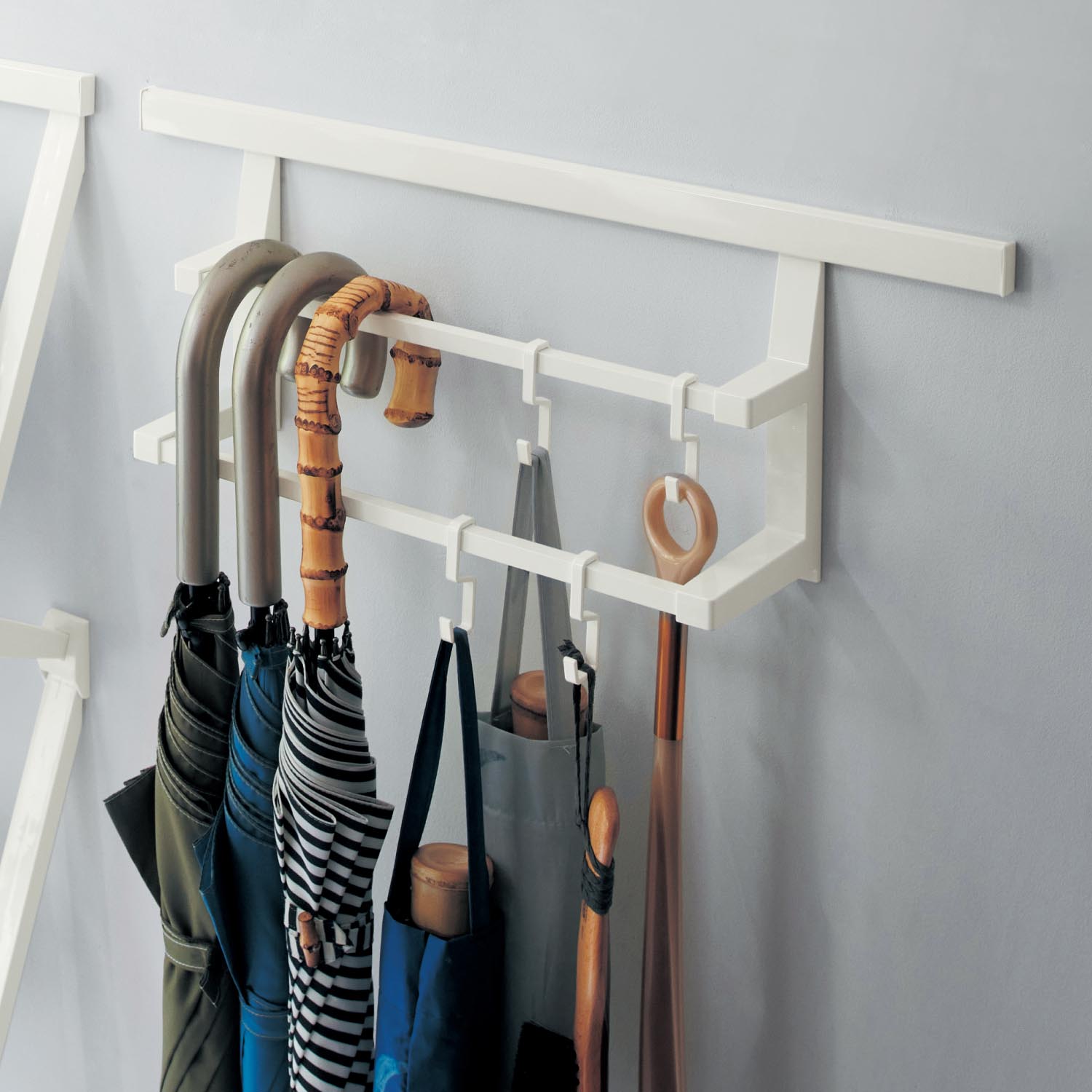 壁面でのカスタマイズ収納が楽しめるシリーズ壁面に取り付けた別売りの専用バーに引っ掛けて使用上下2本のバーで傘を引っ掛けて収納折りたたみ傘を吊るせるフック4個付き壁面から浮かせているので、壁が汚れることもありません靴べらやシューケア用品などの収納にも玄関やサニタリー、トイレ、キッチンなど、狭くて収納に困るスペースにおすすめ