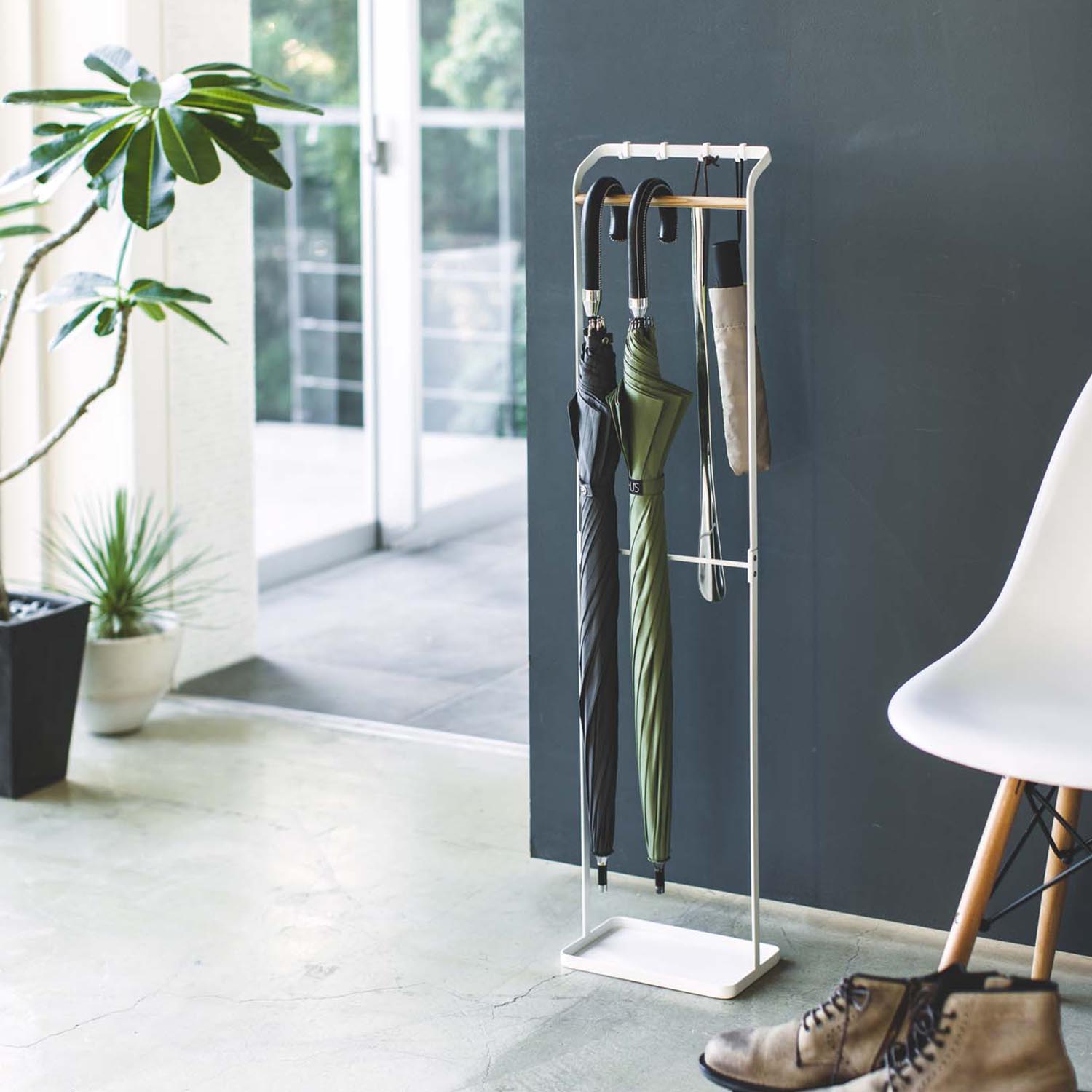 天然木やその端材を大切に使い、製造から研磨作業までを丁寧に手がける北海道・旭川の家具メーカー「cosine(コサイン)」よりぬくもりあふれるメープルの無垢材で仕立てた傘用のラックシンプルなデザインに素材感が映え、上質な雰囲気をただよわせます。バーには長傘を、中央のフックへは、折りたたみ傘などを掛けておくことができます。壁際にすっきり置けるスクエアな形とミニマムなサイズ感で、玄関でも場所をとりませんやさしく上品な風合いが、玄関を明るく演出底面のトレイは取り外して水を捨てることができるので、いつでも清潔に使えます。