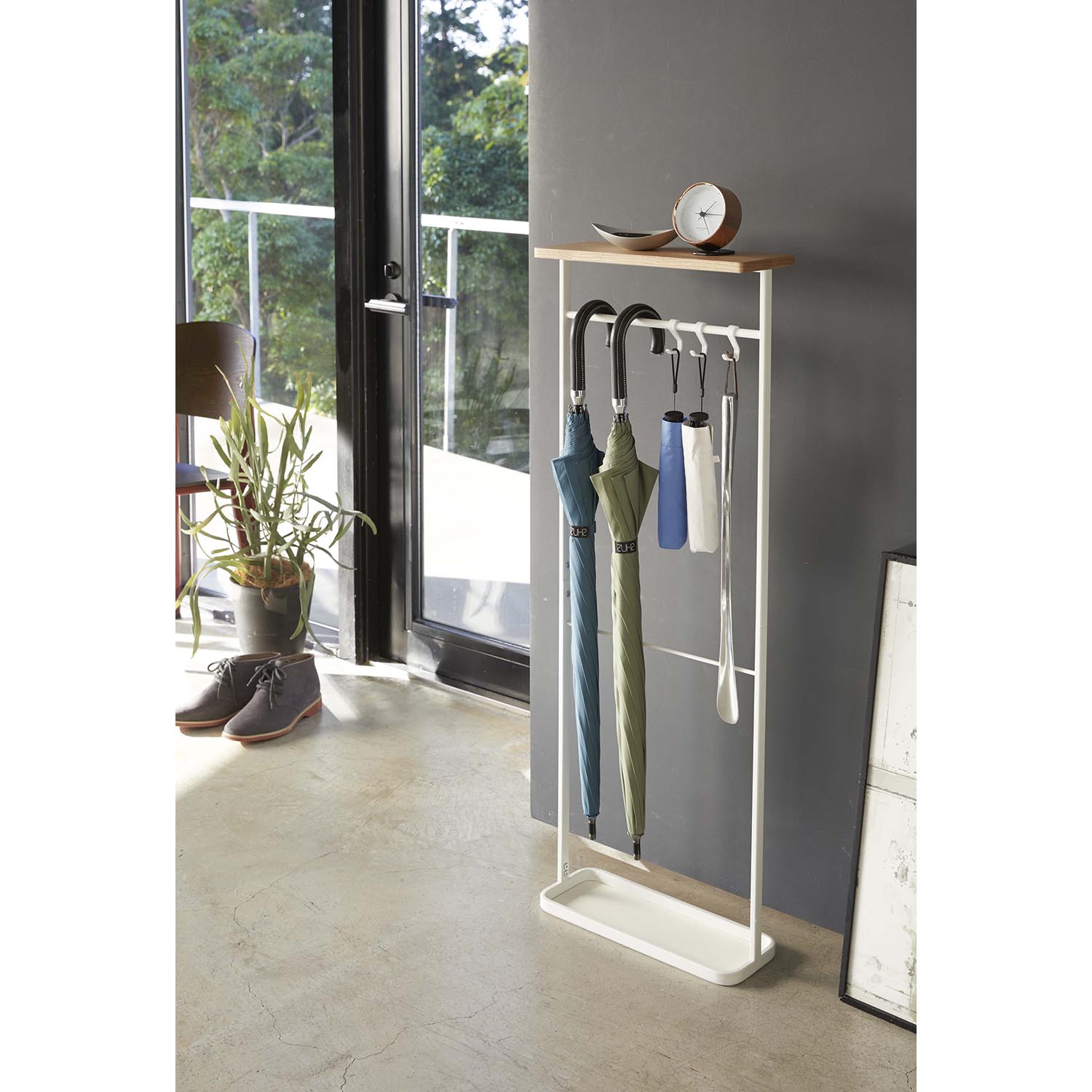 傘を引っ掛けて収納するアンブレラスタンド天板が付いているので、鍵や時計などを置くことができます。付属のフックを使えば、折りたたみ傘や靴べらなど、収納場所に困る玄関まわりの小物をひとまとめに掃除用品などをまとめて収納するのにも便利ですスリムでシンプルなデザインは、スペースのない玄関に置いていても邪魔になりません