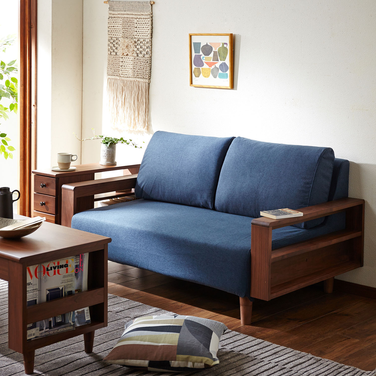 ウォルナット材の美しい木目を楽しめるシンプルデザインで北欧感もある木肘ソファー抜け感のあるフレームデザインの肘掛け部には棚を付け、小さめの雑貨や小物をディスプレイすることができます。手に触れる部分は丸みを持たせているので、柔らかな印象を与えてくれます。カジュアルムードただよう張地はカバーリング仕様で、汚れてもお洗濯OK脚部は継ぎ脚タイプで高さ調節することができ、小さなお子様がいるご家庭にもおすすめです【座り心地】背もたれ・座面ともに程よいクッション性やフィット感があります。