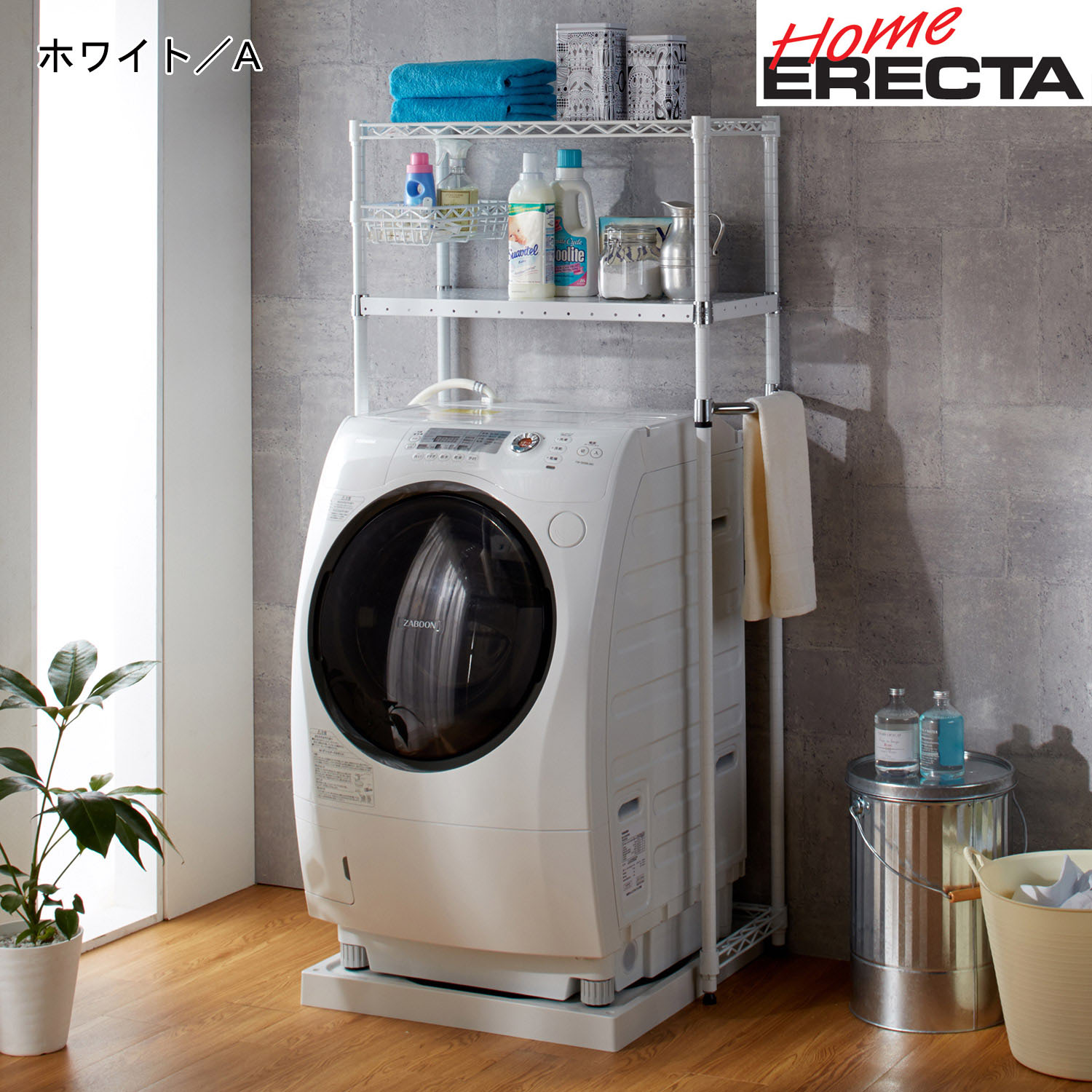 シンプルで力強いデザインと、錆びに強い耐久性、耐荷重性など、確かな品質で世界中から支持されている「エレクター」のスチールラックが、おしゃれな洗濯機ラックに下段の棚板は、洗剤なども安定しやすく、通気性にも配慮したパンチング棚になっています。サイドには、タオルなどを掛けられるバーや、内外好きな場所に取り付けられるミニバスケット付き洗濯機まわりの小物をまとめて収納することができます。脚底にはアジャスター付きで、しっかり安定お好みに合わせて2色、2タイプからセレクトして)