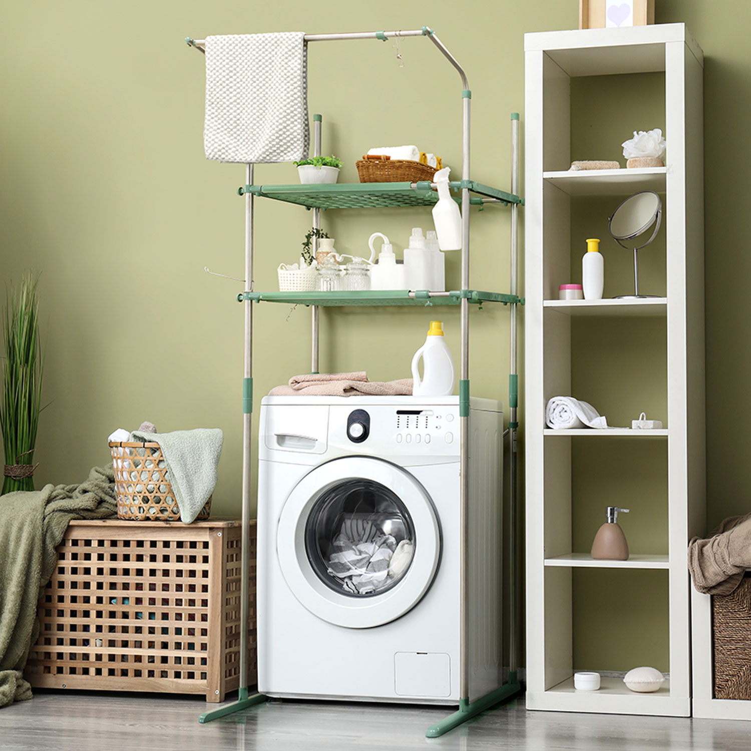 洗濯機まわりのデッドスペースを有効利用できる洗濯機ラック洗濯機の上に2段のラックスペースができ、洗剤やタオルなどをたっぷり収納できます。ハンガーバーが付いているので、バスタオルやハンガーなどが掛けられ便利両サイドにフックが付いて、掛けるスペースも確保おしゃれなグリーン系のステンレス素材。)