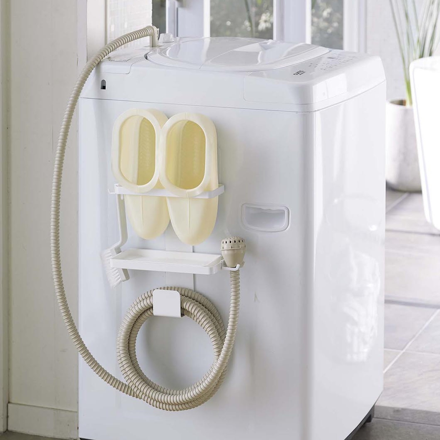 マグネットで洗濯機に簡単設置OK洗濯機の給水ホースや、バスブーツをまとめてすっきり収納できます。濡れたバスブーツの水がこぼれないように、トレーでしっかりキャッチトレーは着脱可能で洗えます。給水ホースホルダーは、先端部分を引っ掛けるだけで着脱簡単付属のフックにはブラシなどを引っ掛けることができます)