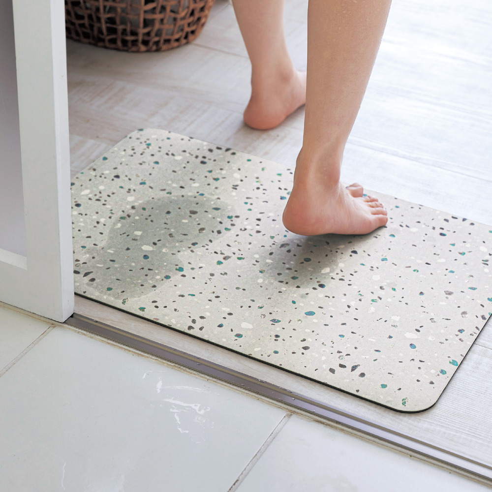 パウダー状の珪藻土入りのバスマットソフトタイプなので、掛けて干したり、丸めて収納出来たり、扱いやすいのが嬉しい汚れてもさっと拭き取れ、抗菌加工で衛生的テラゾー風プリントで汚れも目立ちにくい好きなサイズにカットできる約60×90cmの大判サイズもご用意。水滴をしっかりとキャッチしてくれます。裏面はゴム素材ですべりにくい)
