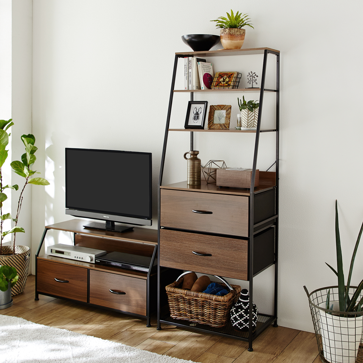 細いアイアンと中天板のオープン部分が軽やかな印象を与える引出し付きのラック棚の奥行は上にいくにつれ、奥行きが浅くなるので、圧迫感を与えずリビングにも置きやすい引出しは実は不織布製なので、リビングで散らかりがちな子供のおもちゃやぬいぐるみの収納にもぴったりです引出し前面にブラウン木目のプリント紙化粧繊維板を貼り付けてあるのが高見えポイント取っ手が木製だったり、下の棚板部分がメッシュなのもちょっとしたデザインポイントですシリーズの家具あります。お手事価格なので、シリーズで揃えてリビングをおしゃれにスッキリ収納できます。)