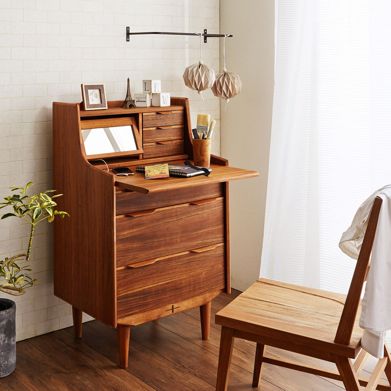 表面にはオイル仕上げをほどこし、木質感を生かしたナチュラル感たっぷりなビンテージ調の風合いに仕上げています。一番の特長はなんといっても、使う時だけ奥行を広げられる、スライド天板を備えていることまた、写真立てや雑貨類を飾った時など後ろに落ちにくい「ころび止め」付きの天面や、たっぷり備えた引出し、使わない時は隠しておけるミラーなどと、使いやすい仕様が満載さらに、ほのかな丸みを持たせた角のあしらいや象嵌細工、やさしく手になじむ曲線の取っ手など随所にまで職人のこだわりが光るつくりが、上質なムードをいっそう引き立てます。